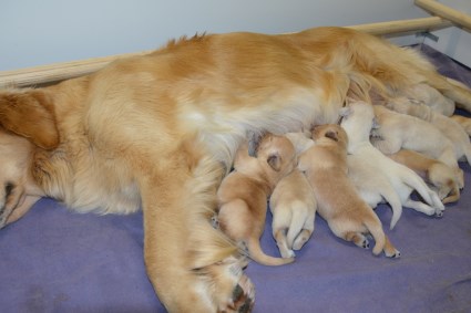 June 28 update - 8 days old. Adele is doing a great job. She is attentive, is nursing well and has a good appetite. The pups are content and growing. All is well.