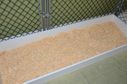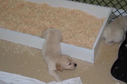 Four weeks old - moving to new quarters. Until now, the pups have lived in their whelping box where Adele was almost always with they to feed, clean and cuddle. Now they must begin the process by which they will become ready to leave us and begin their lives in new homes. In this next 4 week period, they will be weaned, dewormed, vet-checked, vaccinated, microchipped, socialized and matched to their new owners. It seems a lot but each litter manages all the changes while having a lot of fun. So we removed the whelping box and set the area up for the next 4 weeks. Here's what we did: