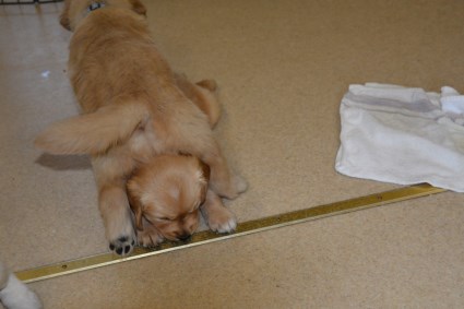 Final day at Setherwood - August 15. This afternoon, the new owners will arrive for the new puppy seminar after which they will take the pups home. Here is how the pups spent their final morning at Setherwood. First, they played on the floor while their facilities were cleaned.