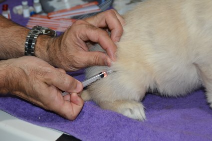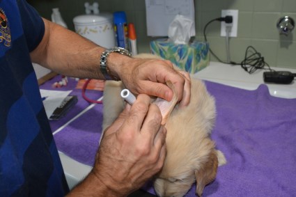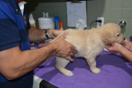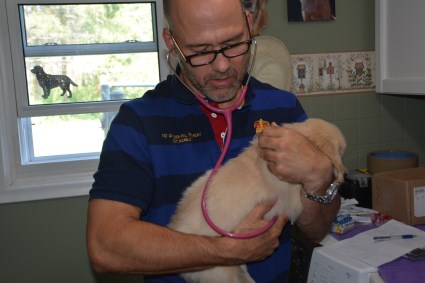 Veterinary exam and vaccination - August 6. Dr. Wayne Cole of the Uxbridge Veterinary Hospital visited to check each pup and give the first set of shots. Here is Mr. Green's account of this very important process.