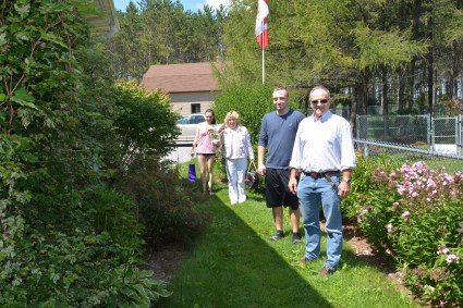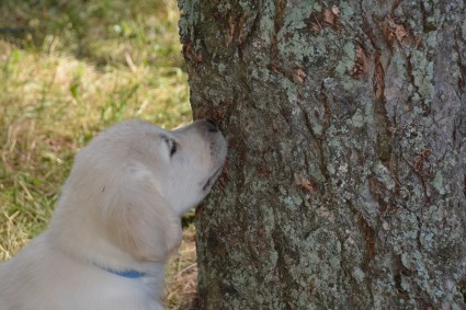 Visiting hours - August 9. It was a beautiful day - soft breeze, not too hot and the deer flies had taken a vacation - so the pups were outside. As we had finished matching the puppies, the new owners were able to spend time with their own pups as well as with some others. The pups had a great time, experiencing grass and dirt for the first time. Miss Pink had a fun time trying the tunnel, digging and getting quite dirty. This was the last visiting before the pups leave us next weekend.