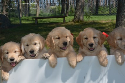 To another great group of families. So, after weeks of waiting, the day to take your puppy home has finally arrived. The pups have been weaned, vet-checked, vaccinated, micro-chipped and socialized. They are completely ready for life with you. It is a bitter-sweet time for us as we always enjoy our time with each group but we know that all the pups are going to people who will give them the love and care they deserve. Our thanks to all of you. We have enjoyed meeting and getting to know you and we thank you for choosing Setherwood Goldens. Please keep in touch. Here are the pictures of the pups as they leave us.