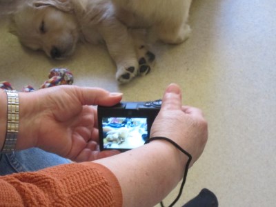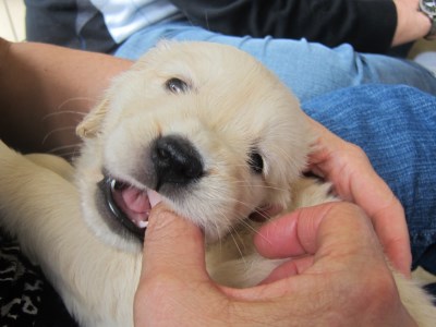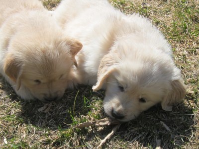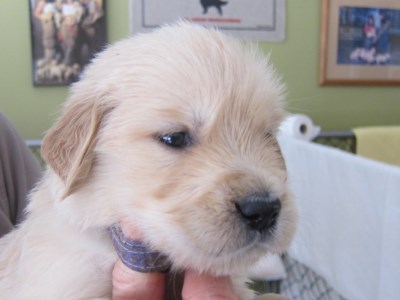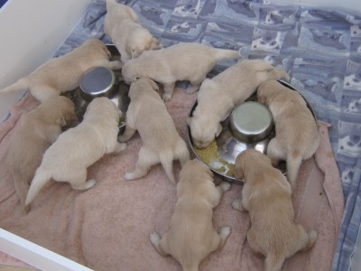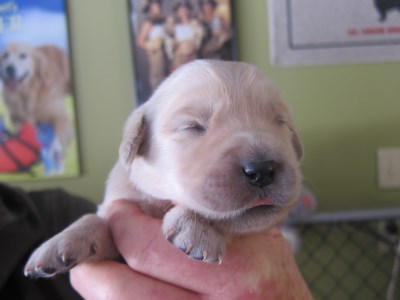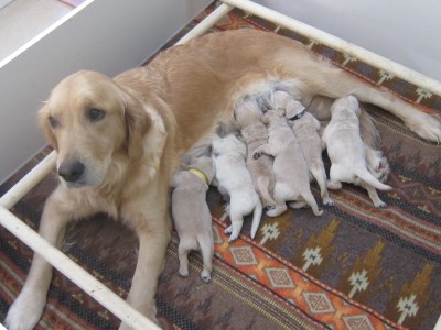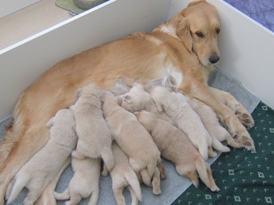 friends in Uxbridge. Malloy lives at the well-known Blackpool Kennels in Shanty Bay. He has mainly English Goldens in his pedigree. He is mid-sized, cream in colour with dark pigmentation and has a happy outgoing nature. We feel that he is an excellent mate for Violet. Birthday - March 8, 2014. Violet delivered her first litter beginning at 11 am and finishing at 7:25 pm. The birth weights ranged from 13.5 ounces to 16.5 ounces. We have been letting her nurse them in two groups of 5 to make sure that the smaller ones can feed. We change the groups each hour. She will have all 10 overnight. All is well.