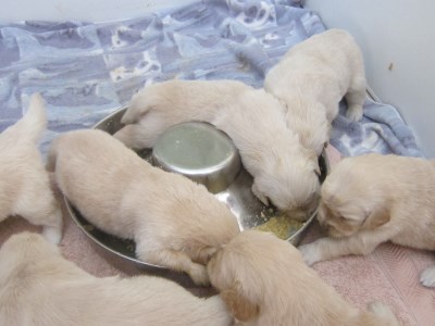 Three weeks old. Play time is now. Most litters begin to play soon after their eyes are open but this bunch is exceptionally active. They are walking well and are very good eaters of the soaked starter kibble that we introduced the day they turned three weeks. This will help to supplement Violet's milk supply. For her part, Violet is doing her job well but reluctantly. She seems to feel that cleaning the pups is not in her job description. Here area a few pictures taken on March 30.