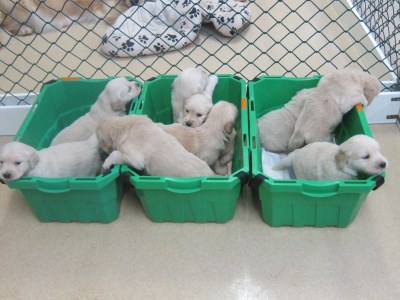 Moving day - April 4. The pups are almost 4 weeks old so it is time to move them out of the whelping box to more spacious quarters. Here is their story.