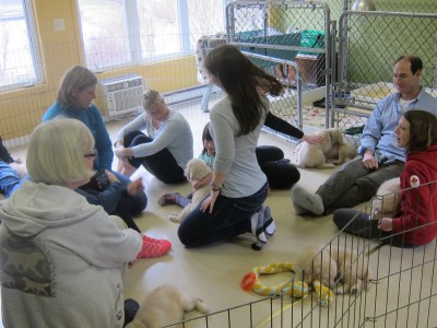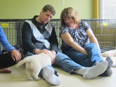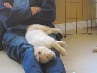 Five weeks old. The pups have continued to progress as expected. They nursed twice each day (not nearly enough!) and ate solid food 3 times (not nearly enough!). Violet nurses them dutifully but would much rather go for walks with the other dogs which she has been doing this week. The pups really enjoy the weekly visitors as these pictures show.
