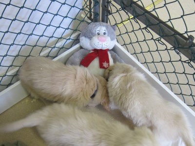 them grow. Each week, we will post a picture of the pups with a favourite toy (whose name is Winchester) so that you see how the pups are growing.