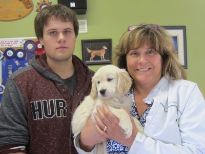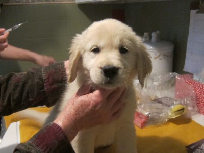 Veterinary examination and first vaccinations - May 2. Dr. Dan of the Uxbridge Veterinary Hospital visited to check each pup and give the first set of shots. Here is Miss Green's account of this very important process.