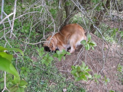 Although Iris' pups are more than 2 weeks of age and are quite comfortably housed, Iris still wants to dig. We filled the previous hole and covered it about a week ago so that Iris could not dig there. So she found another location nearby and this was the result. (We have since filled this one as well.)