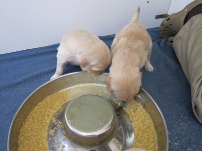 Four weeks old. The pups continue to do well. They are eating well, learning to play with their siblings and are enjoying the visitors. They are wearing coloured collars so they can be easily identified. Iris still feeds them twice each day and we are feeding them 3 times daily.