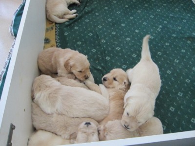 April 9 - they have arrived: 2 males and 7 females. Iris began her labour at 12:30 am, delivered the first pup at 3:10 and the last at 6:50. So it was a long but productive night! The birth weights averaged 17.7 ounces (from 12 to 20 ounces). As of 9:40 am, all was well.