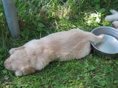 Five weeks old. The pups are almost weaned. Iris does not have a lot of milk and the pups are eating solid food well. De-worming has started. The good weather allowed the pups to spend some time outside. Please click HERE for pictures. It appears that Iris' tendency to dig has been inherited. Here is the proof: