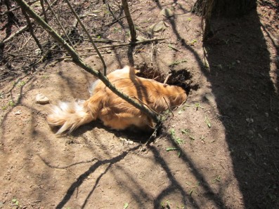 Many of our girls want to dig a den when they are approaching the end of their pregnancies. Over the years, they have worked in one part of the dog yard not far from the house. Iris has continued the tradition and did her best to go deeper than any had gone before.