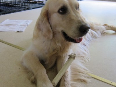 Sophie is a calm, confident girl and a friend to all she meets, dogs and people. She is fairly big with a blonde straight coat and a wonderful way of talking to us. She had a litter of six last year with Trip as the father and the pups turned out very well with a nice combination of both parents in looks and temperament. Please click HERE for Trip's pedigree information and HERE for Sophie's pedigree information. Both Sophie and Trip have clearances for hips, heart and eyes and are in excellent health. Birthday - June 7, 2013 - 5 males and 2 females. Sophie delivered her 7 pups on June 7 beginning at 7:45 pm. She delivered number 6 at 1:25 am and was showing all the signs that she was finished. June went to bed at 3 am. When she checked again at 6:30 am, she found that Sophie had delivered a very small but vigorous male all by herself. As of 10:30 am on June 8, Sophie and her brood were all doing well. Here are a few pictures. Some are red as they were taken with the heat lamp on.