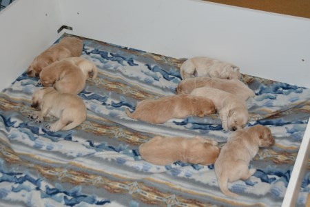 One week old - January 18, 2018. Geneva's pups are acting and growing as expected. Geneva is a dedicated mother, spending almost all of her time with her pups. As she can't nurse all 10 (Isla has one of her pups) at the same time, she nurses 5 while the other 5 sleep in heated green bins. We then change the groups each hour during the day. Geneva has all 10 overnight. Everyone is doing well and we do not anticipate any problems.