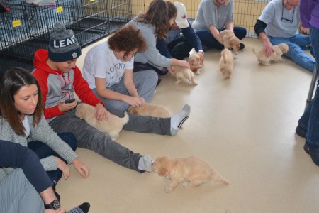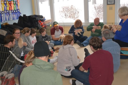 Visitors - February 11. Another full house. We tried to show pups' new trick where we open the gate and they all stream out of the pen. Most declined so we had to carry them out as usual. Maybe next week.