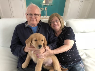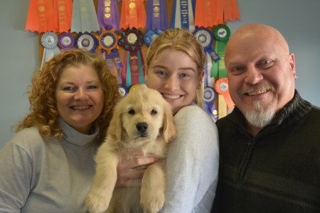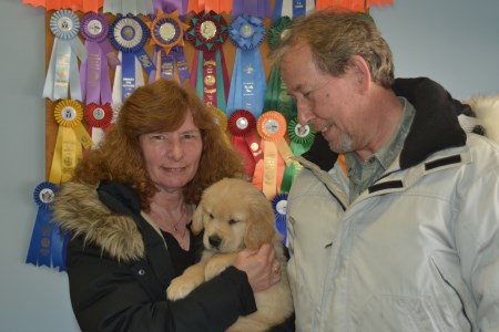 Going home - March 3, 2018. The pups are about 7 1/2 weeks old. They are weaned, microchipped, vet-checked, vaccinated, socialized, dewormed and matched to their new owners. They are energetic and outgoing and are completely ready for their new homes. So today their owners arrived to take them home. They attended the seminar, received their pups and posed for a family photo. All went well. We want to thank the new owners for selecting a Setherwood dog. We know that you will all give the pups the love and care they deserve. Please keep in touch.