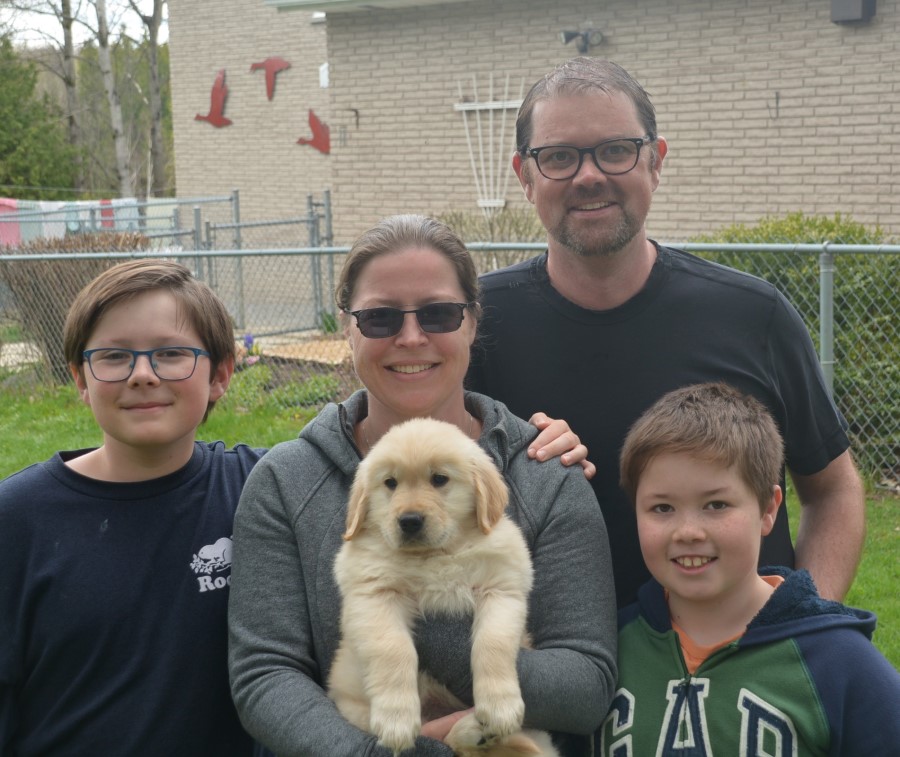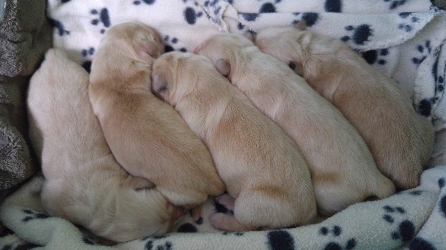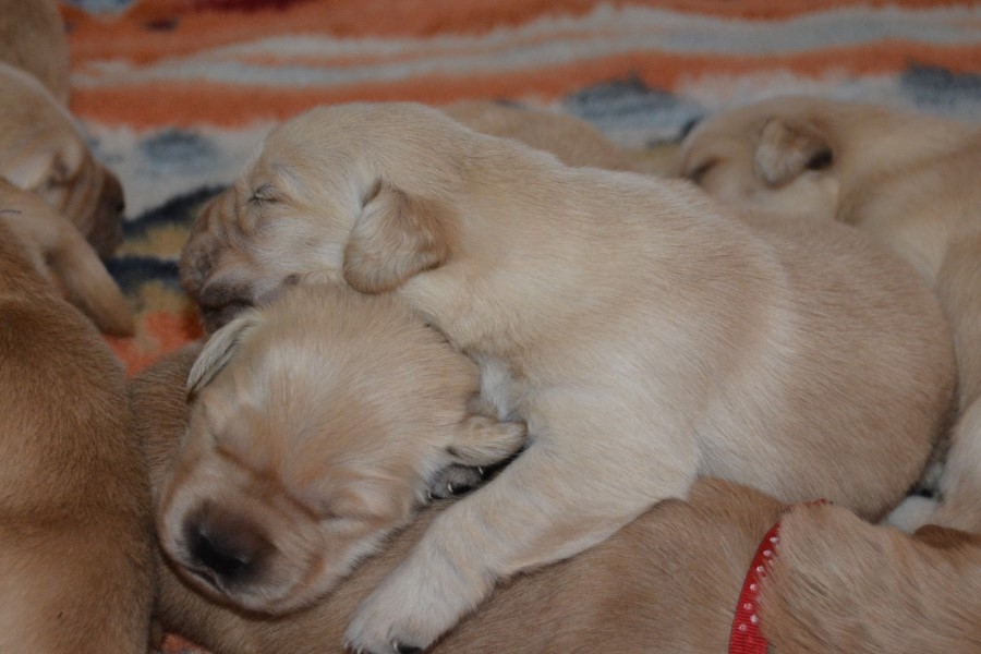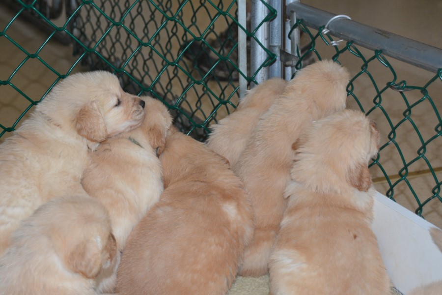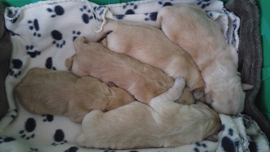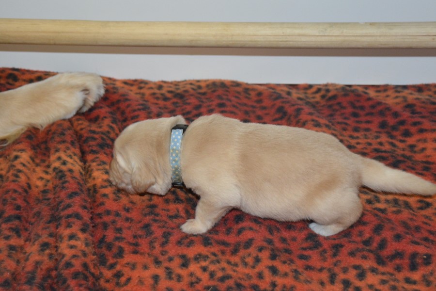Update April 27. The pups are 5 weeks old today. We put their coloured collars on so we can identify them until they leave us. Here are their pictures. We tried to put them in the same order as the pictures in the April 24 update.