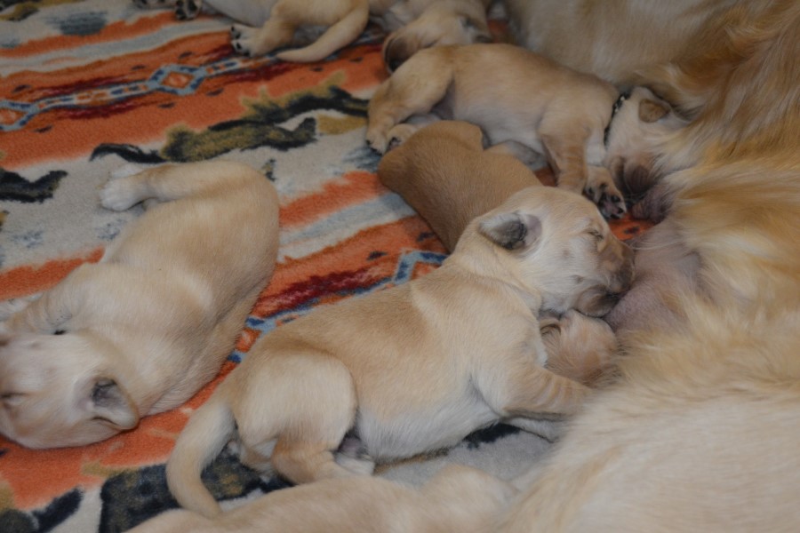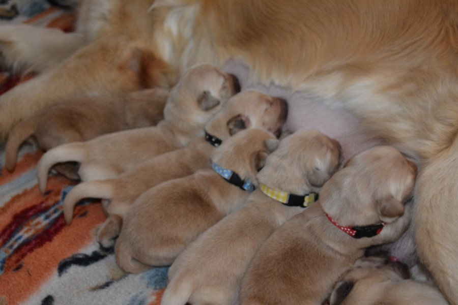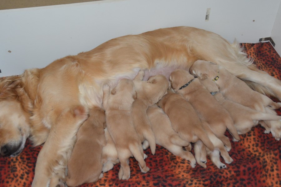 Update March 29. Leaving the 4 smallest pups with Millie full-time has already shown results. Their weights are now close to the average weight on the others. In a day of two we should be able to remove their collars. If there are others that should spend more time with Millie we will put collars on them. Click the picture to see a 2 minute video showing the pups nursing. You can see how they stop moving when the milk starts to flow at which point their tails become stiff and quiver.