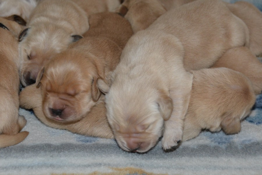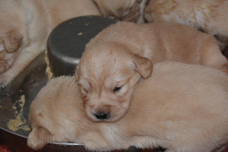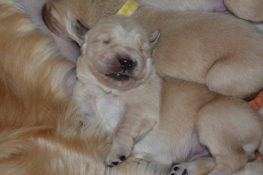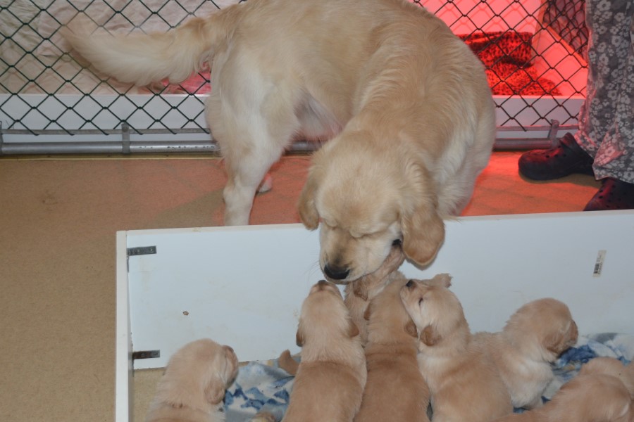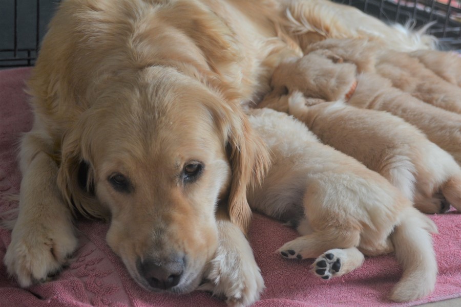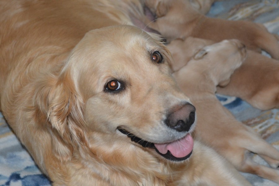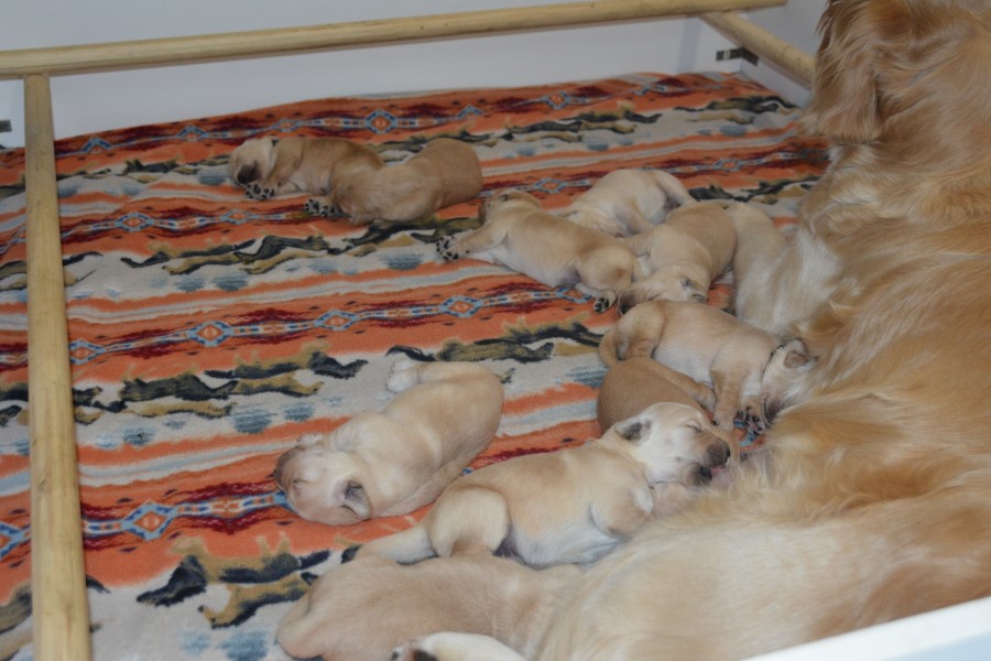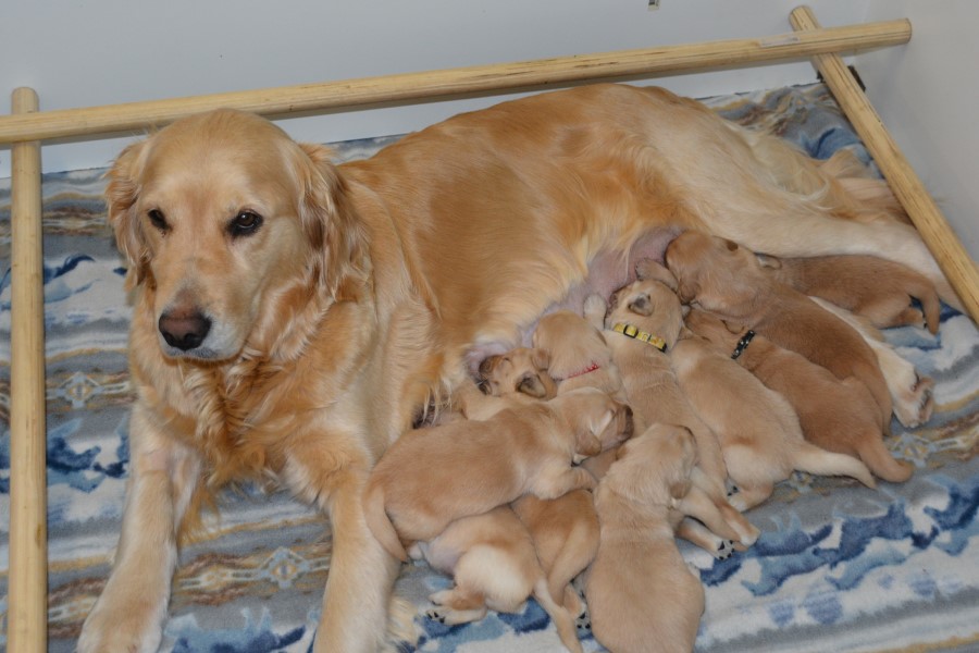 Kygo was imported as a puppy from the O'Quince kennels of Indiana, USA, by Bowbell kennels of Port Hope, Ontario. He comes from a long and distinguished line of titled Goldens from the show and obedience rings. He is a mid-sized boy with a medium-coloured easy-care coat. He has very dark eyes and pigmentation. He achieved his Canadian show championship handled exclusively by his owner. He has health clearances for hips, elbows, heart and eyes. Kygo has sired several litters of puppies whose outstanding quality is their easy-going and biddable nature. Birthday - March 23, 2020. Millie delivered her litter of 10 by planned C-section without complications. The pups were vigorous and vocal right from the start. Their average birth weight was just over 1 pound which is normal. After we had arrived back home, we put Millie and the pups in the whelping box. Millie made sure all were nursing well then took a well-deserved nap. Our thanks to Dr. Rick Doner and his staff at the Beaverton Crossroads Veterinary Services for their excellent work with Millie. Great job as usual.