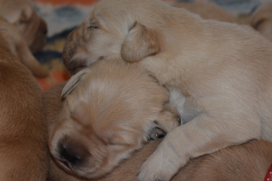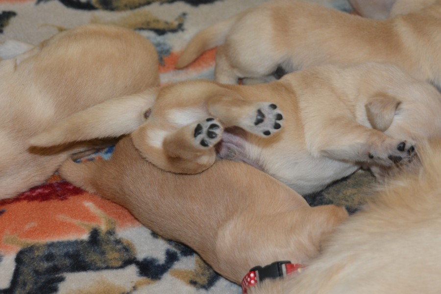 Update March 28. Millie is still quite dedicated but is willing to spend a few minutes away. All is as expected. Now that the smaller pups have collars we see that they are not as aggressive nursers as the others so they don't get as much milk. Being with Millie full-time will help them. The pups are spending almost all their time either sleeping, nursing or thinking about nursing. Here are a few pictures of the pups in sleep mode.