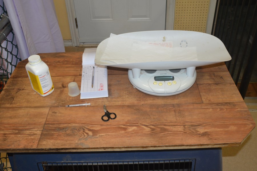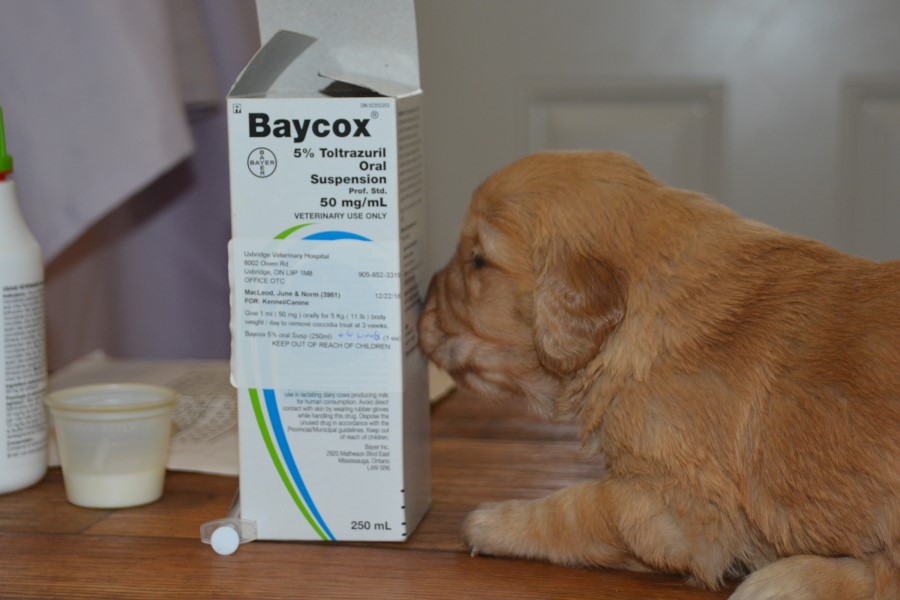 Update April 13 - 3 weeks old. The pups are 3 weeks old today and they are all doing well. They are mobile, can hear and have discovered their voices which they often use all at the same time. Millie is fine, eating well and maintaining her weigh. Everything is in order. Two weeks ago we started the deworming process. Today we gave the first of two doses to kill coccidia, a microscopic parasite that might be present and that could cause the pups to develop diarrhea. They will get the second dose at 6 weeks. Here are pictures of the process.