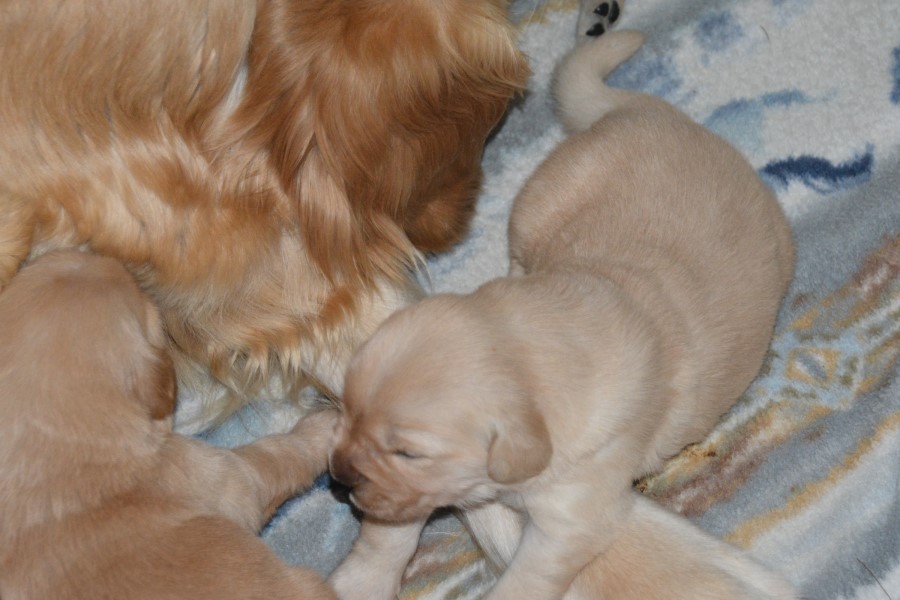 Update April 3. As the pups grow, there is increased competition for feeding spots. And, in most litters, some of the pups are not aggressive feeders and are pushed out of the way by the aggressive ones. So we are holding back the four most aggressive feeders for a few minutes to give the less pushy pups nursing spaces. Click HERE for the latest nursing video. You can tell when the milk starts to flow because they stop pulling and concentrate on drinking (and wiggle their tails). The pups' eyes are beginning to open although their vision is still not good. This will develop over the next week or so.