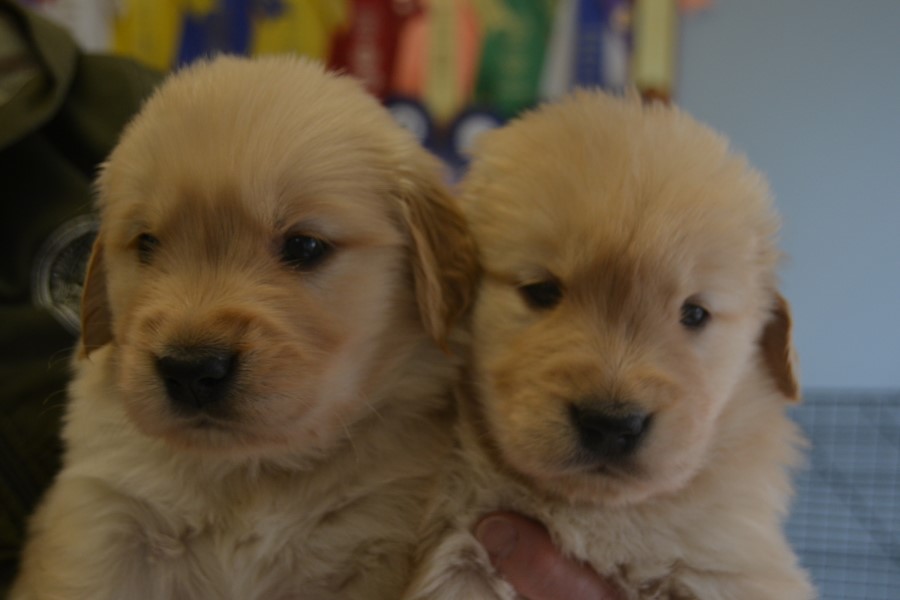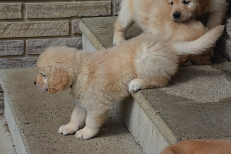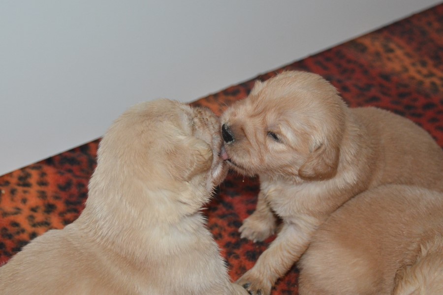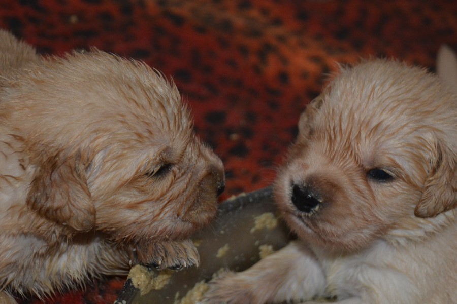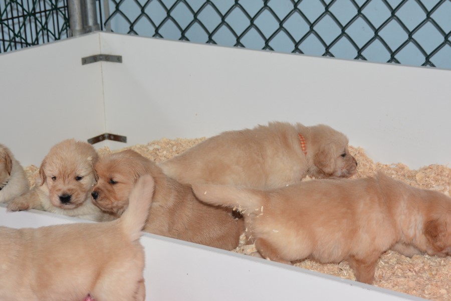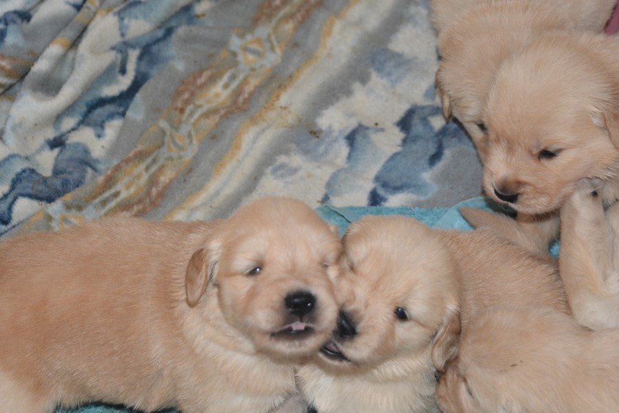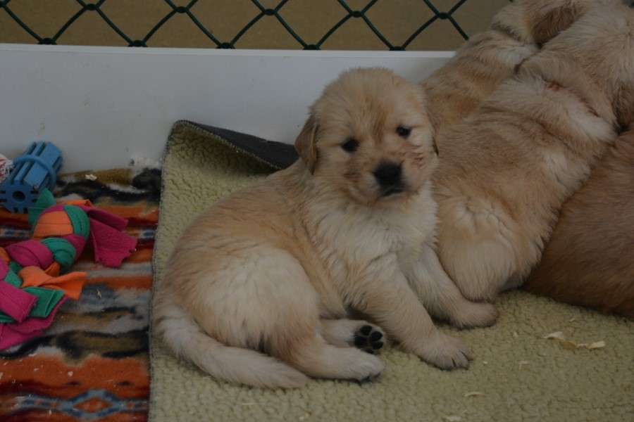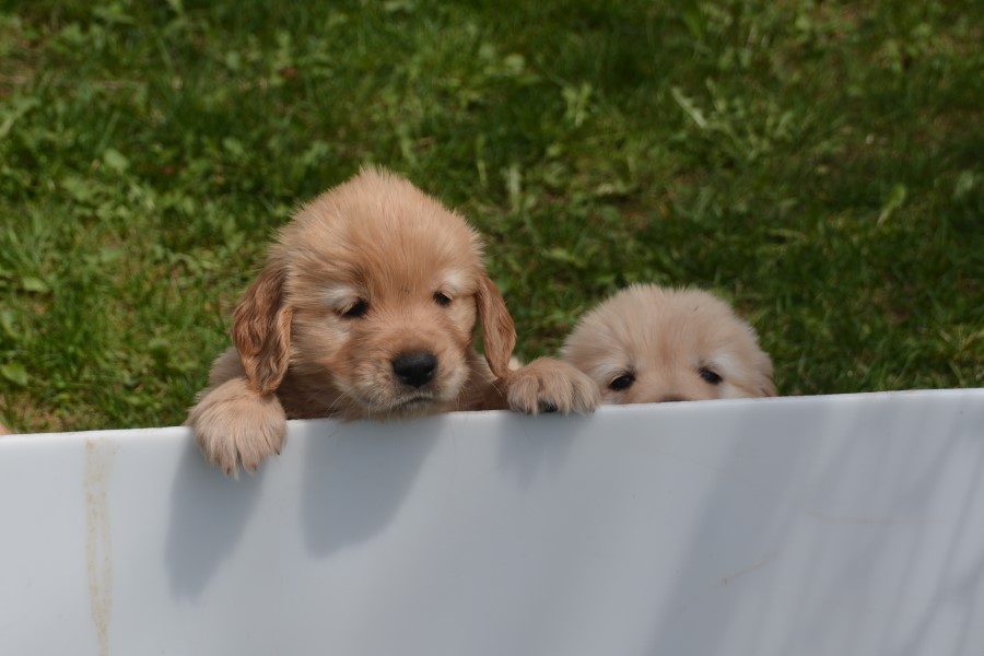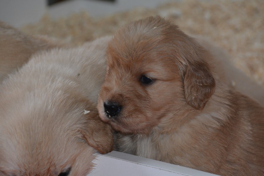 Update April 20 - 4 weeks old. The pups have reached the half-way point of their time with us and they continue to do very well. Their appetites are great and they are active and inquisitive. AND they are using the wood shavings instead of the blankets (well, mostly). They learned this in just 3 days which is exceptional - and a big bonus for us! They were given a second dose of dewormer today and we trimmed their front toenails as they were very sharp. As always we are having fun with these guys. Here are pictures taken today.