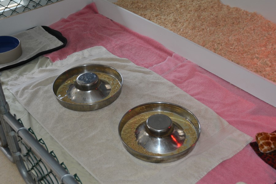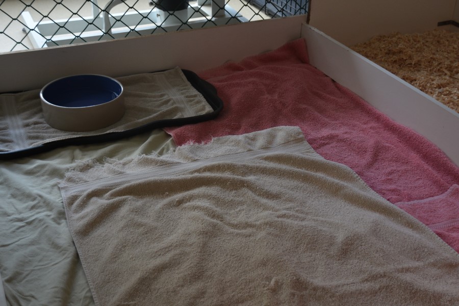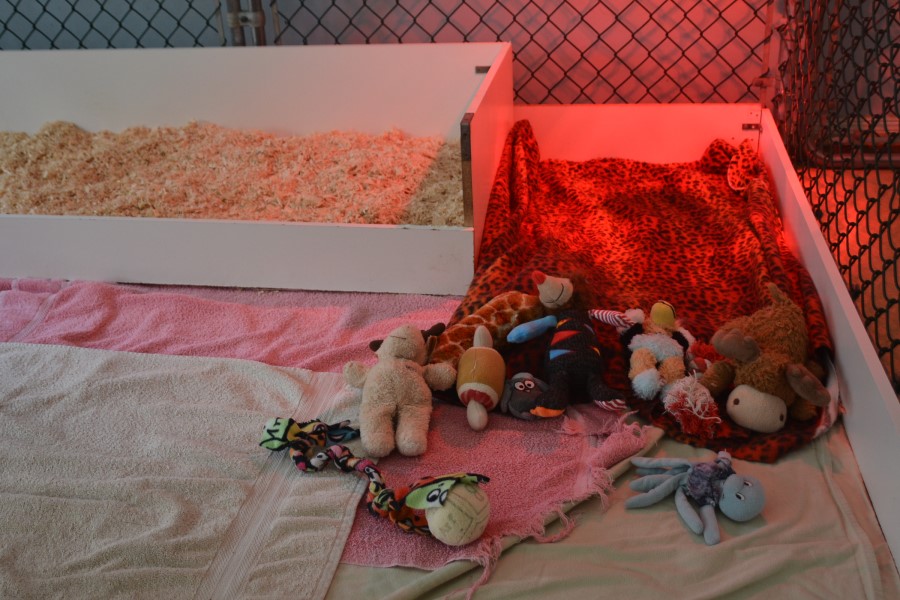 Update April 26. The pups had been using half of the available pen space. Millie was using the other half as her nursing area. As the pups are outgrowing their area and Millie is now nursing only once per day, we gave the pups the whole area and added a second litter box. They made use of the extra space right away. Here are pictures of the area before and after the inmates took possession.