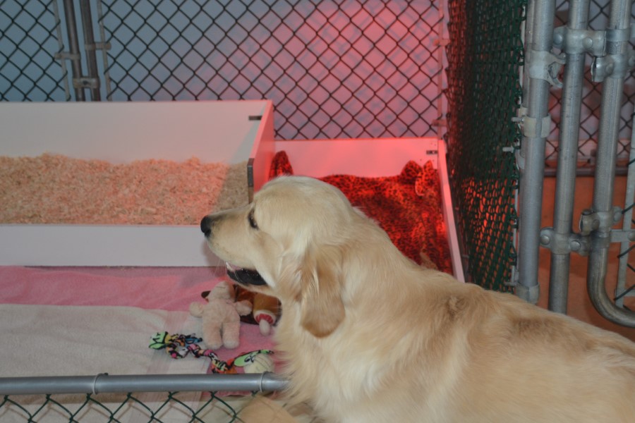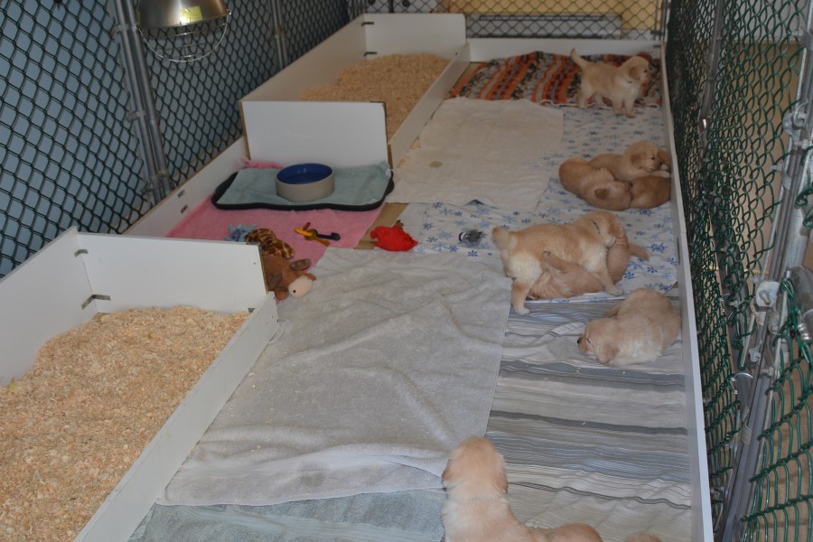 Update April 15. HERE is a short video entitled "An after breakfast romp" which we shot this morning. The pups are fed every 4 hours during the day. Half are fed solid food while Millie nurses the other half. They are becoming used to this routine and become quite animated just before feeding starts. HERE is a video showing the process. It uses the very latest video techniques. Feel free to be impressed! Update April 17. The next four weeks will be a time of change. Before the pups leave us, they must be weaned, de-wormed, microchipped, vet-checked, vaccinated and socialized. They must also be encouraged to develop their individual personalities and learn to be comfortable with people. It's a lot to experience but essential if they are to be ready for life in their new homes. So as the pups will be 4 weeks old soon, it was time for us to move them from the whelping box that has been their home. Millie will continue to nurse them but will not stay with them. We will feed them their starter ration several times daily. As the weeks progress, the number of nursings each day will decrease so that the pups are weaned by the time they reach about 6 1/2 weeks of age. Soon after, we will change their diet to 3 daily meals of regular puppy food. One of our jobs is to teach the pups to use the wood shavings when they relieve themselves. We do that by putting them on the shavings at the end of each nursing/feeding. At the start there are many accidents but eventually, they will do all their business in the shavings, leaving the living area clean. As is usual, the pups were first concerned about their new surroundings but soon settled in. Here are pictures taken today.