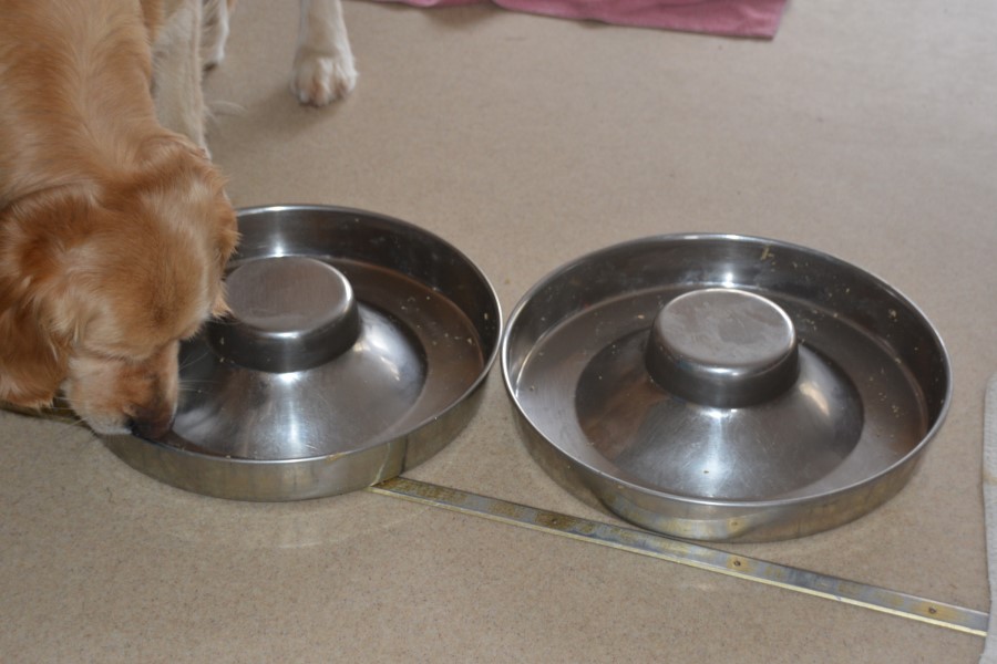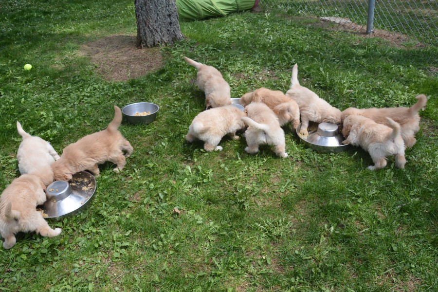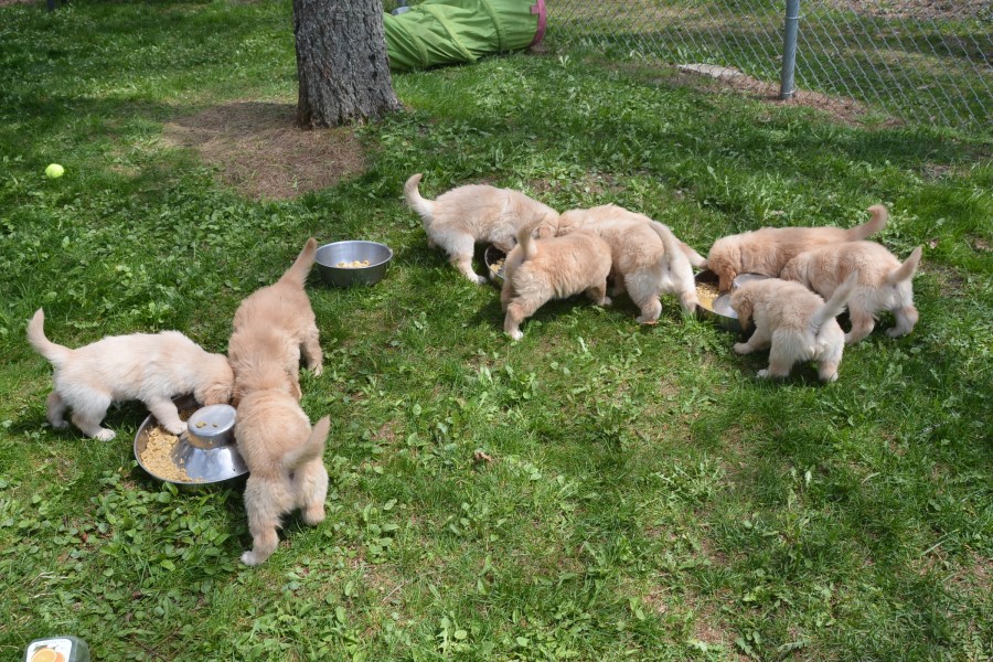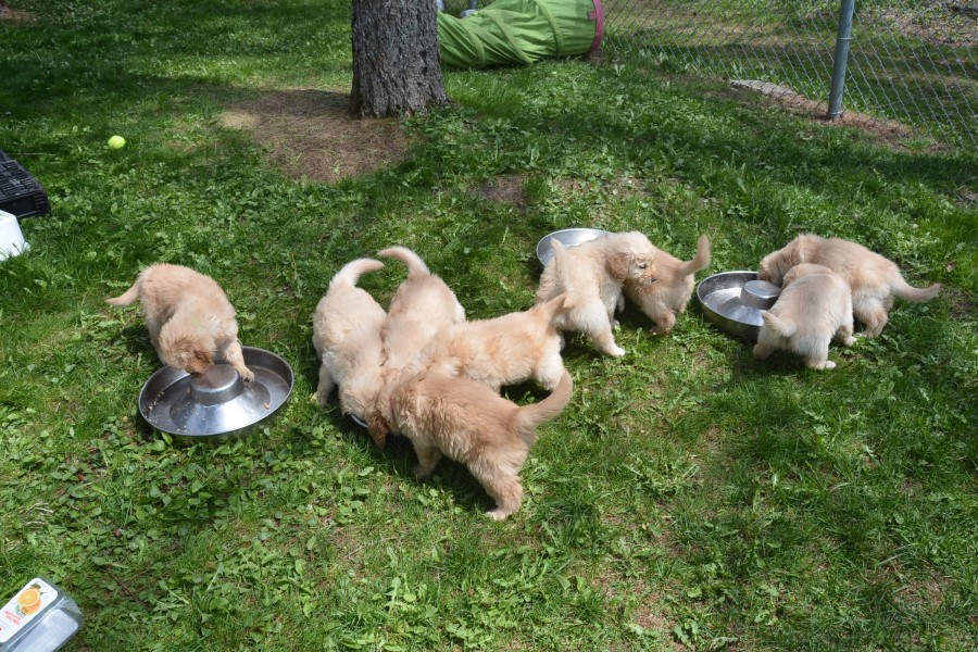 They ate their lunch outside today. The food was served in 3 large bowls and 1 small one. They all went to the large bowls, ignoring the small one until the others were almost empty. One by one the pups found the small one until there were four heads in the bowl which was being pushed across the grass. In the end, all the bowls were empty and the pups then spent a few minutes cleaning each other's faces.