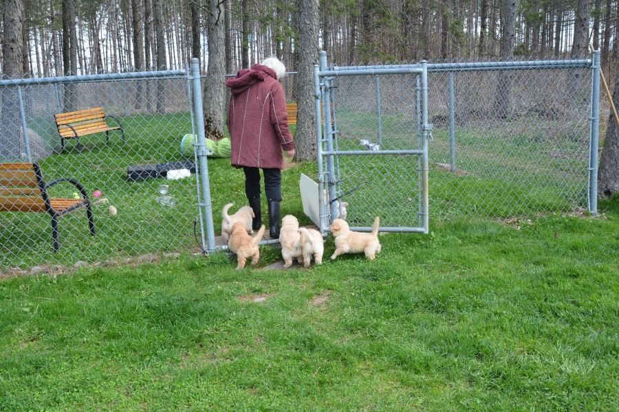 Update April 29. Here are two videos, one showing the pups at play in the afternoon (click HERE) and the other of them eating their supper (click HERE). The second one is entitled "Feeding Frenzy" which gives some idea of their manners. Otherwise, it was just a normal day. Update May 1 - first time outside. The weather cooperated this afternoon so we were able to take the pups outside for the first time. HERE is a video of the event. Update May 2. Each morning, we let the pups play on the floor while we clean their pen. They have become quite good at coming out of the pen when called. Today was the first time we called them to return to the pen after cleaning. Nine of them did well. Mr White had trouble but later complained that the instructions weren't clear and demanded an apology for the name he was called. Here's the video. Update May 4 - Six weeks old. The pups are six weeks old today and are doing very well. They are almost completely weaned and have started the conversion from the starter ration they have been eating to regular puppy food. They are energetic, inquisitive and loving. Today the pups spent most of the morning and half the afternoon in the outside puppy pen. Here are pictures of them coming down the steps from the dog room (still a bit scary), running across the grass and finally going into the pen.