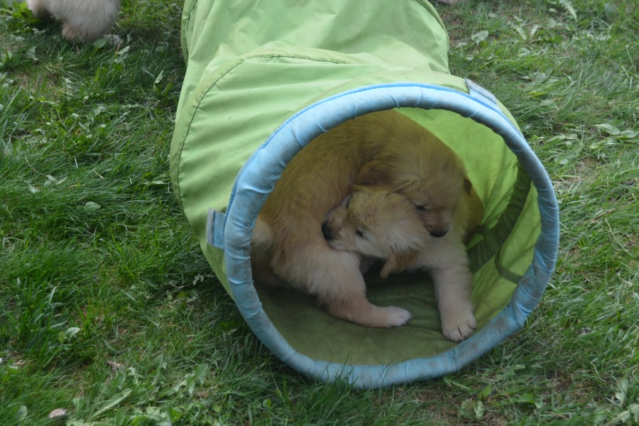 They seem to have a lot of fun wrestling, playing in and on the tunnel and climbing on the overturned plastic crates. They haven't yet learned to overturn the water bowls or dig enormous holes but will no doubt discover them soon. Here are today's pictures.