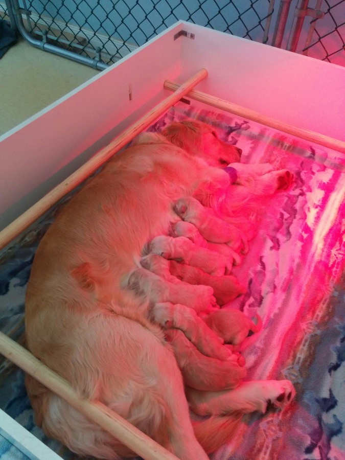 Update - March 24. Millie is nursing and cleaning her pups and the pups are nursing well. To be sure that all the pups have access to milk, we are keeping 5 in a heated green bin while the remaining 5 are with Millie. Every hour, we switch. Millie will have all 10 during the night and we will check her at about 3 am to be sure that all is OK, let her out and give her a few snacks. Here are pictures taken on March 24.