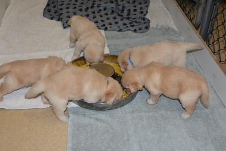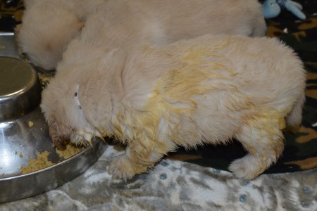 First feeding - November 29, 2017. Although the pups are not yet 3 weeks old, we decided to see if they would eat solid food (Royal Canin starter kibble soaked in hot water until soft). Some were ready and others not. Nora enjoyed the clean-up.