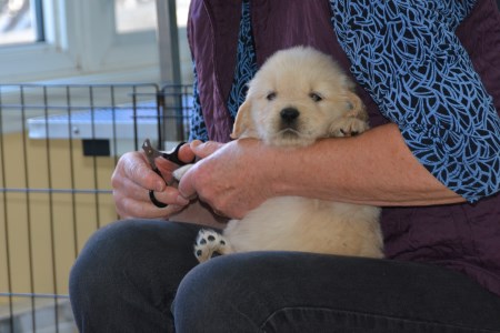 Five weeks old and visitors on December 16 and 17. The pups are great. They are healthy, active and inquisitive. They are weaned and eating their mushy meals (4 each day) with enthusiasm and speed. Their personalities are developing and they are gaining confidence every day. Next week they will be given another dose of worm medicine. Except for that indignity, it will be a week of growth and fun. During one of this week's visiting times, we clipped the pups' nails. Not all enjoyed the experience (2nd picture).
