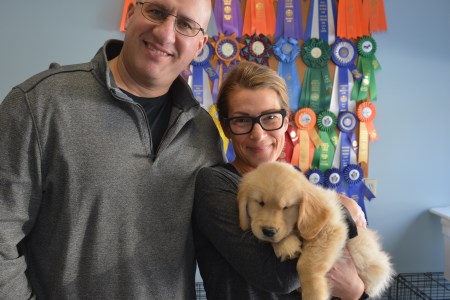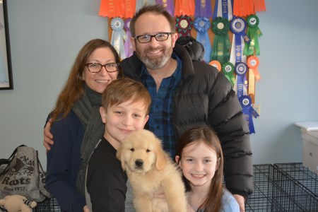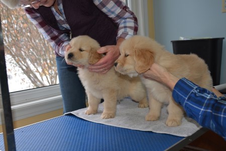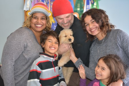 Update - January 6, 2018. The pups were due to leave us but, due to a health issue affecting some of them, only 5 are ready to leave. As of today, 4 have gone to their new homes and are doing well. One more will leave tomorrow. We will keep the others for another week to see how they do. Hopefully, most will be able to leave next weekend. Here are pictures of the 4 pups meeting their new owners.