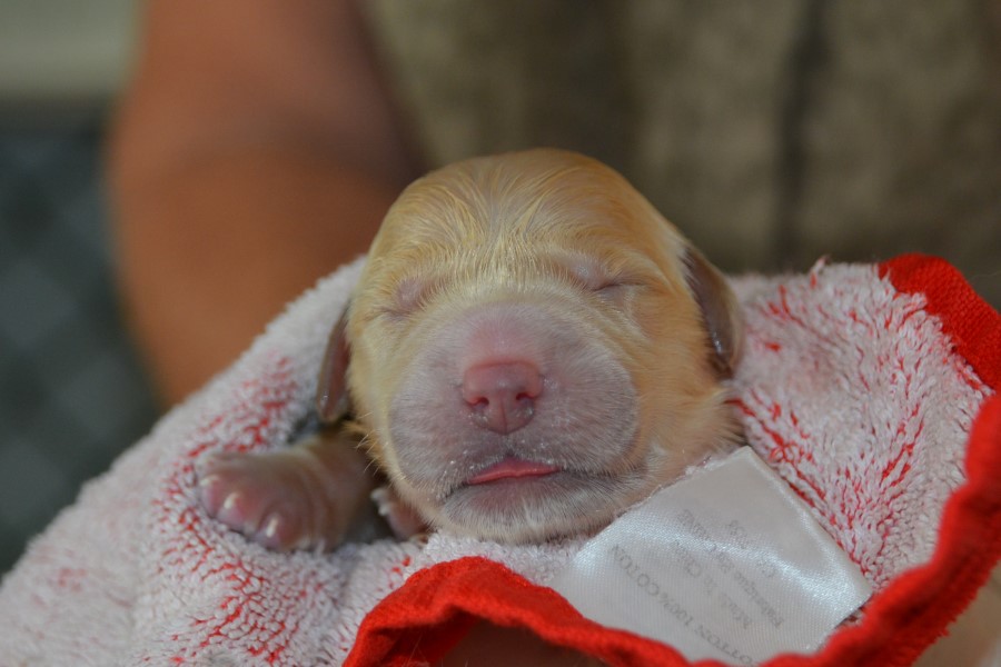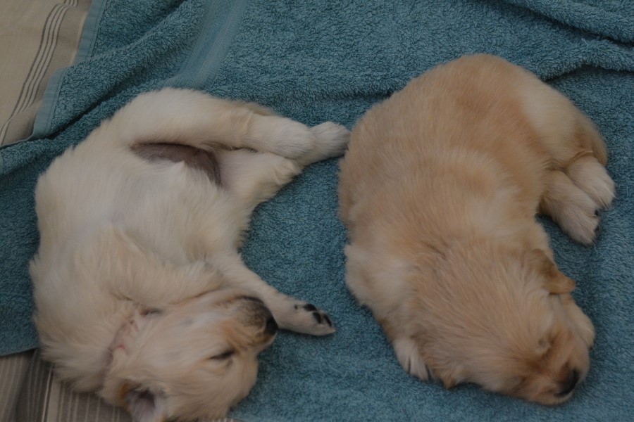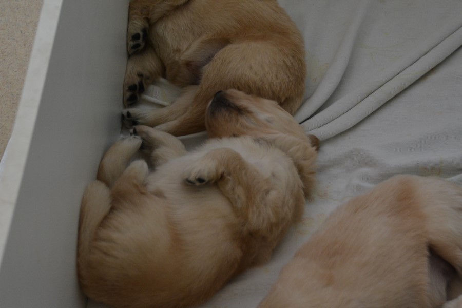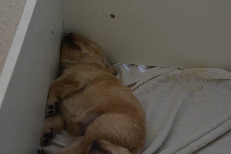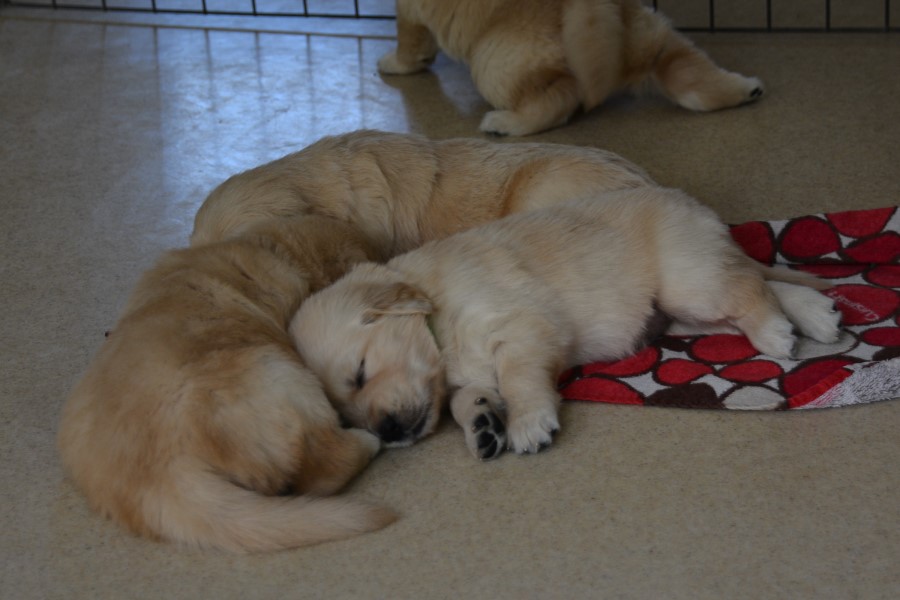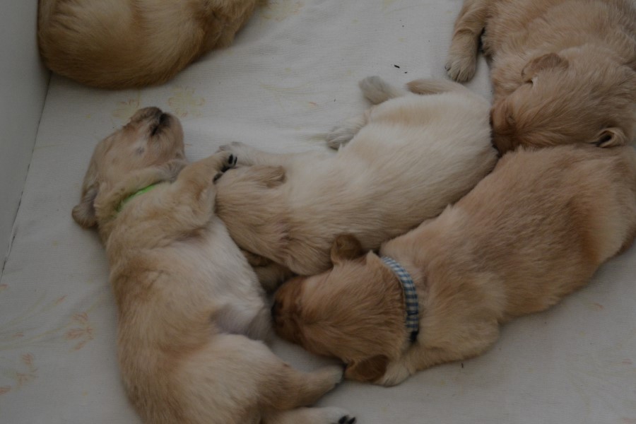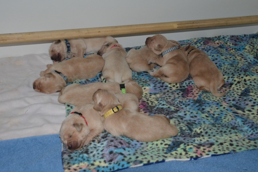 Update - August 20, 2020. A few days ago, we started to feed the pups solid food (Royal Canin starter ration soaked in warm water until soft). Most were keen to try while others were not. By the third meal, almost all were eating well and were connecting the sound of the feed bowls, the click of the gate and June's voice with mealtimes. Here is a VIDEO of the third feeding. All continues to be well. They will be 4 weeks old soon and are ready to leave the whelping box for a larger space. We plan to move them tomorrow. The pups still spend much of their time sleeping. Here are pictures of these "sleeping beauties".