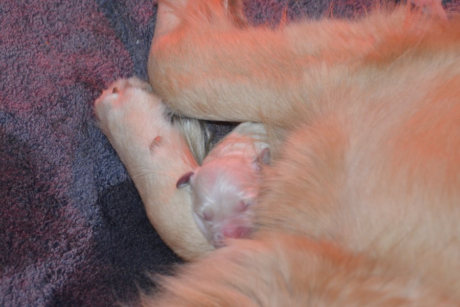 Update - August 1, 2020. Tilda and her pups continue to do well. The pups have grown from a range of 14 to 17 ounces at birth to 24 to 28.5 ounces today. Tilda spends most of her time with them and they take advantage of the open bar. We are tracking individual weights so we can quickly identify a pup that begins to fall behind. Fortunately all are gaining at present. Here are a few pictures.