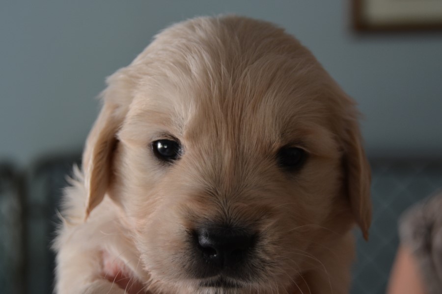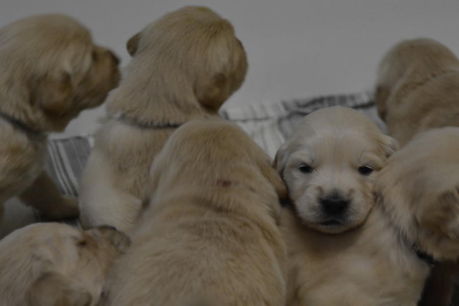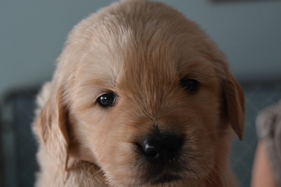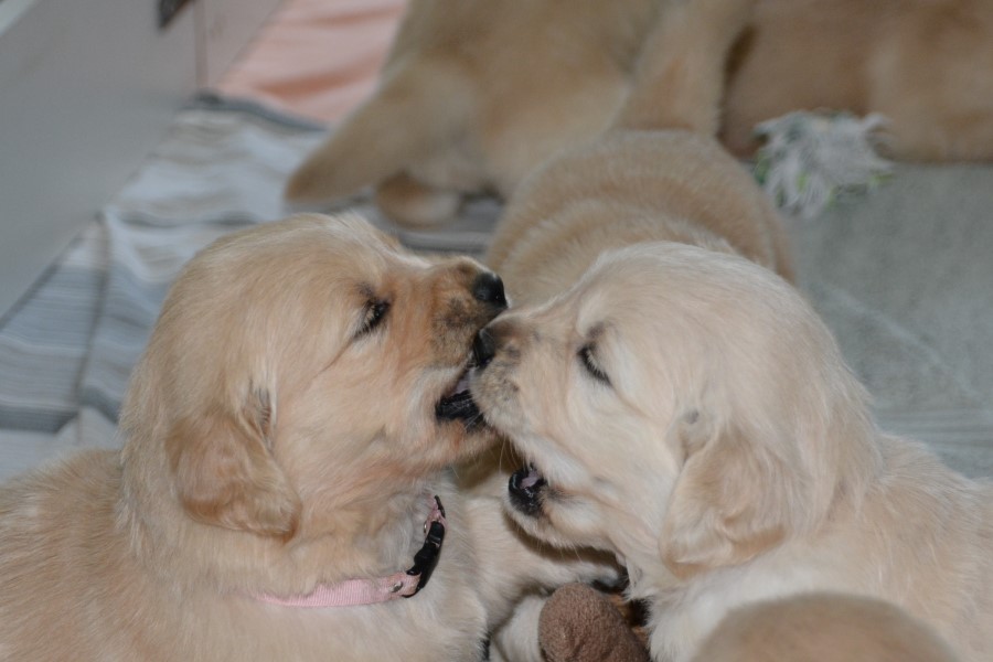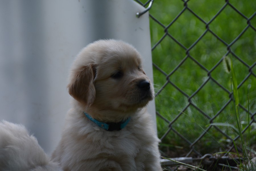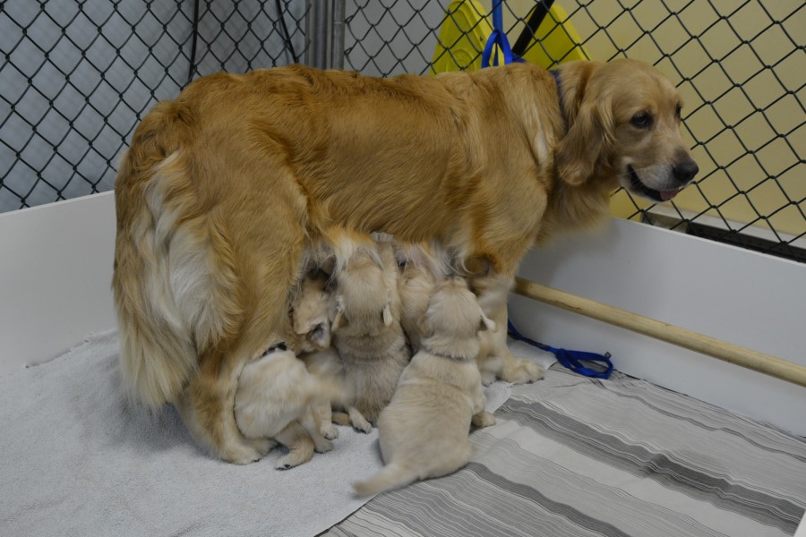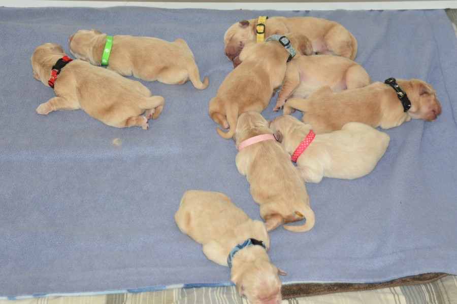Update - August 22, 2020. The pups are 4 weeks old today and to celebrate this milestone, they were given the coloured collars that will identify them until they leave us. They were very excited to have their pictures taken as you can see from their exuberant expressions.