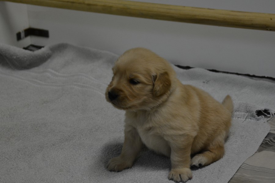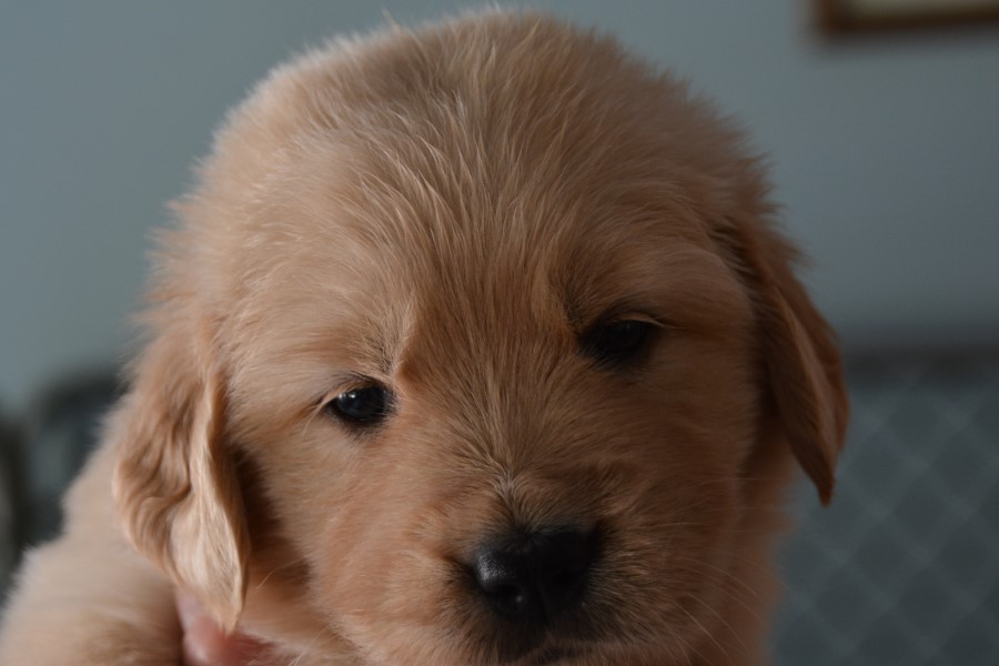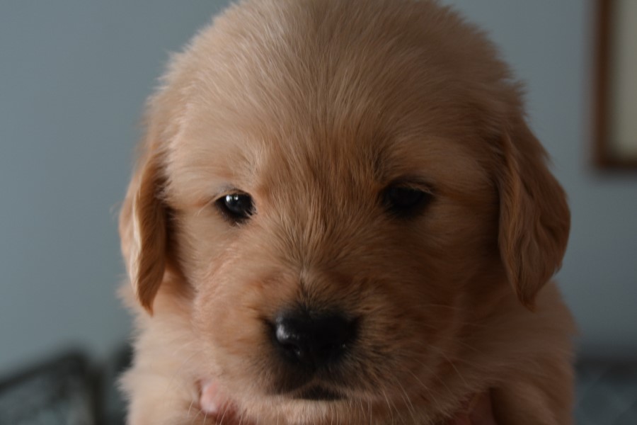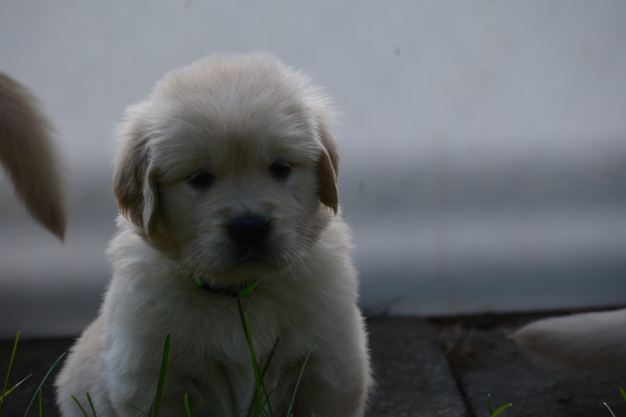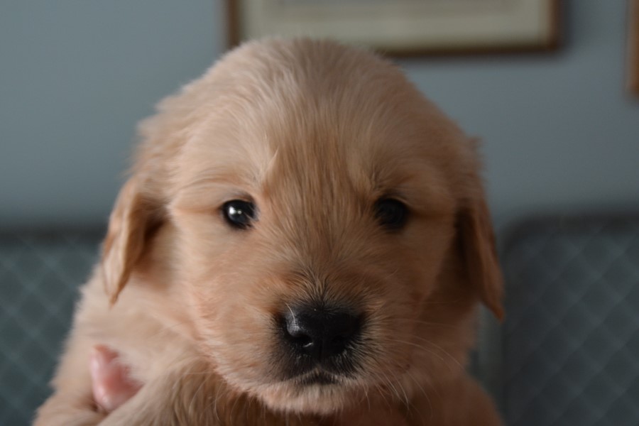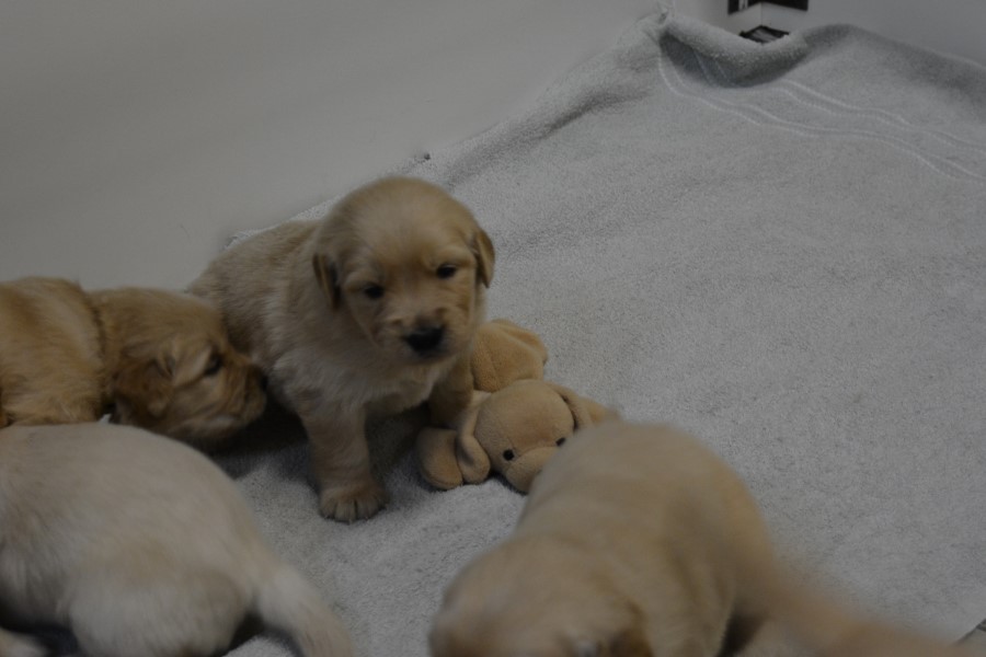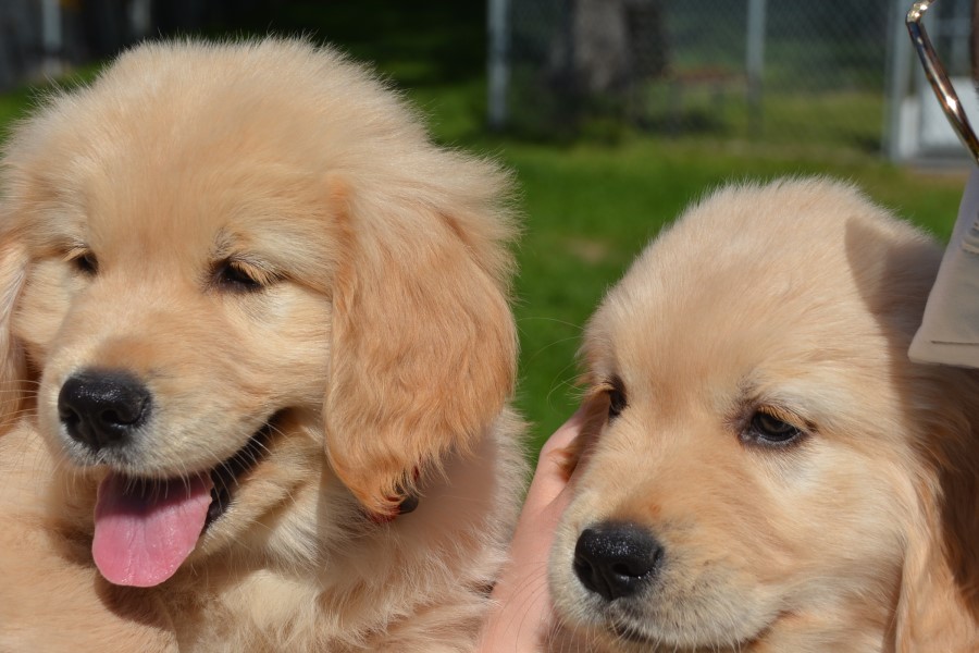 Update - August 22, 2020. The pups are 4 weeks old today and to celebrate this milestone, they were given the coloured collars that will identify them until they leave us. They were very excited to have their pictures taken as you can see from their exuberant expressions.