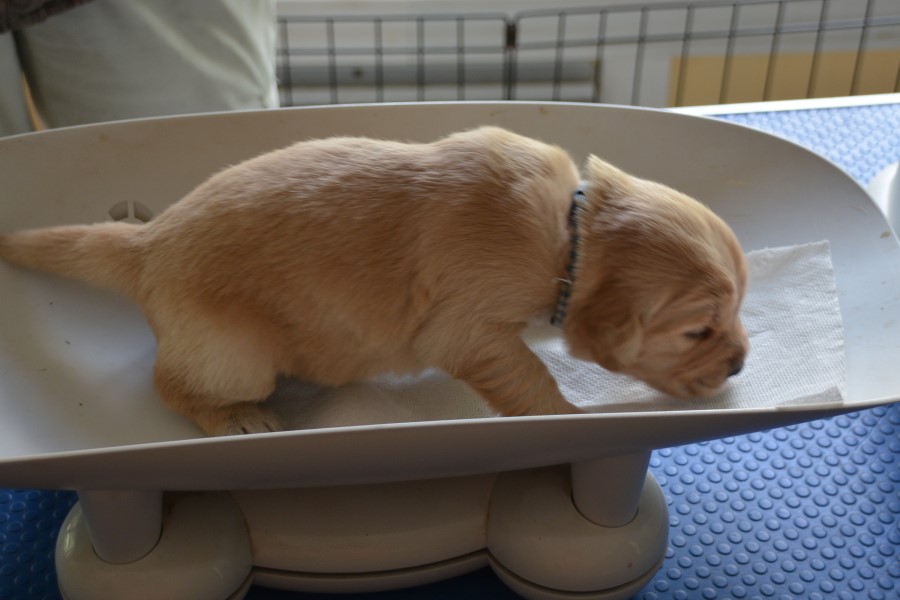 Each day, Tilda leaves the pups to eat or go outside for a quick walk. When she returns, the pups become quite excited and crawl over to nurse. Here is a short VIDEO showing the pups responding when Tilda arrives. Update - August 10, 2020. The pups are 2 weeks and 2 days old today and they are great. Tilda is producing a lot of milk and so the pups are growing quickly, gaining an average of 1 pound in the last week. Their eyes are opening (on schedule) and they are moving around well - not quite walking but close. We started the deworming process today, beginning with a worm med for roundworms. The pups cooperated during the weighing and didn't mind the taste.