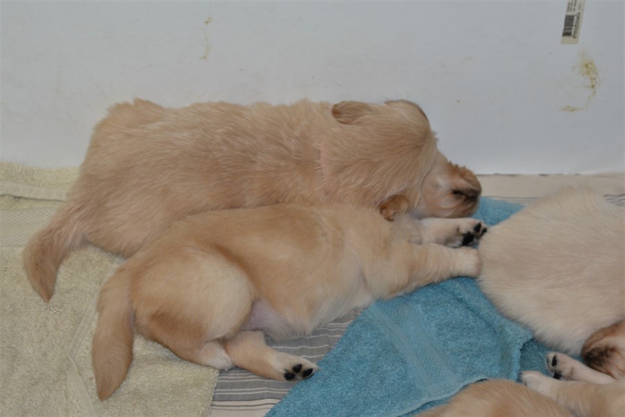 After the deworming, the pups were very keen to see Tilda. Here is a VIDEO showing how well they are moving and how their tails become stiff when the milk starts to flow. Update - August 15, 2020. The pups are 3 weeks old today. Their eyes and open and they can see and hear. Their average weight is now about 3 pounds 5 ounces. They are quite active and aware of their surroundings. They have started to play. We will try to feed them solid food soon. Some litters are ready at this age and others not. We shall see. Tilda is still well and all the pups are growing as expected so no problems. She sometimes feeds them while standing up and the pups are adapting. Here are pictures taken today.