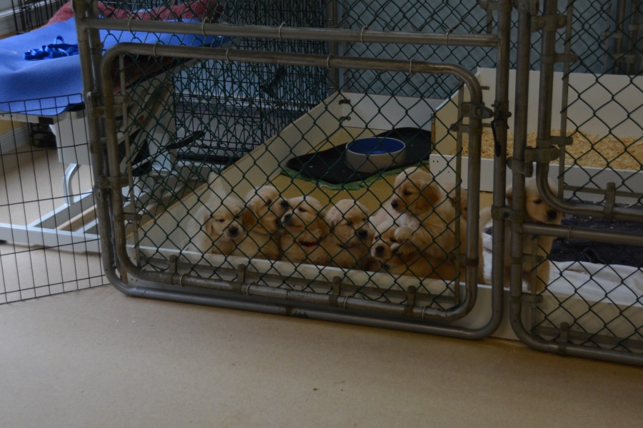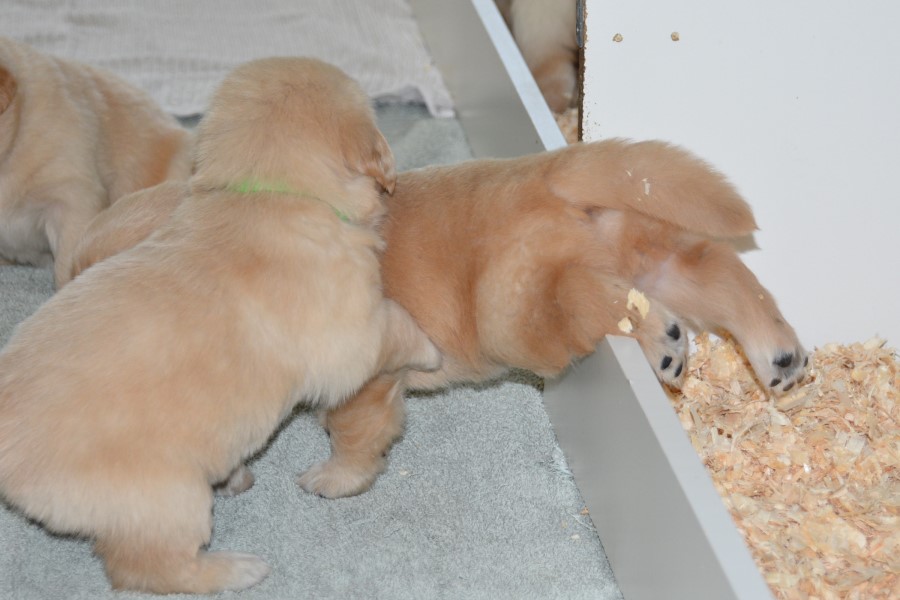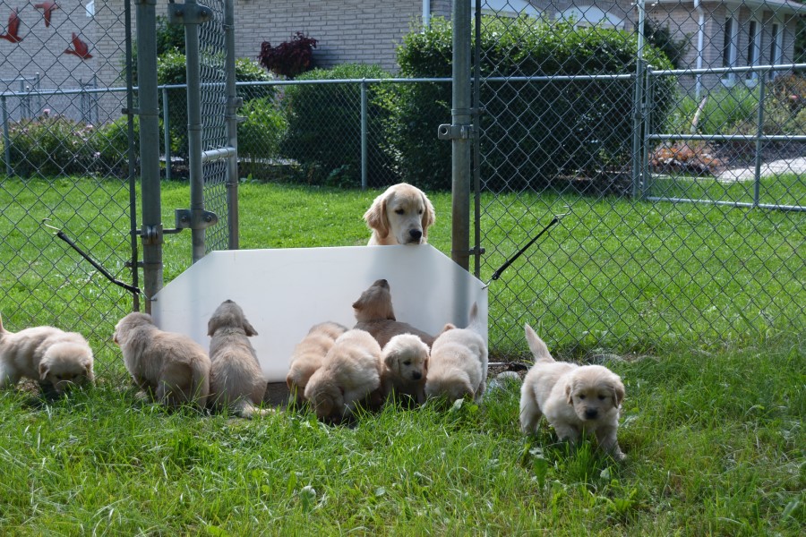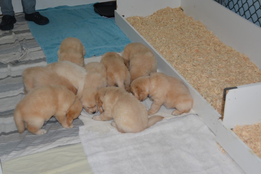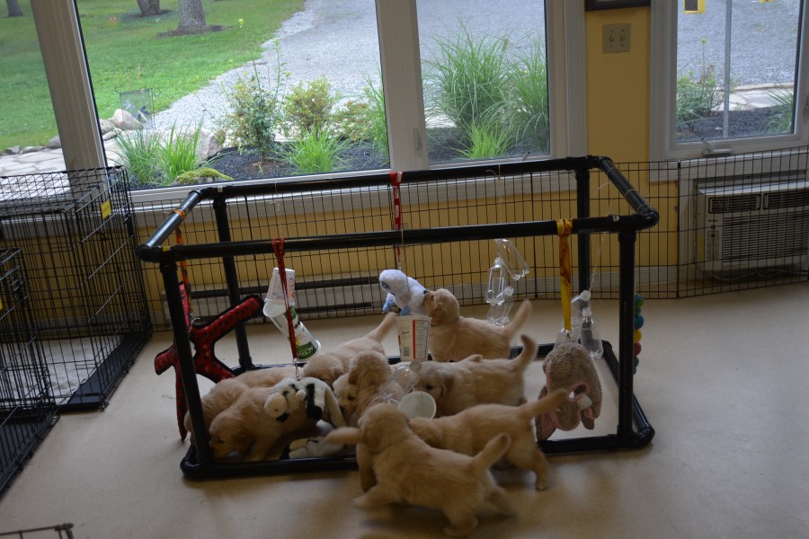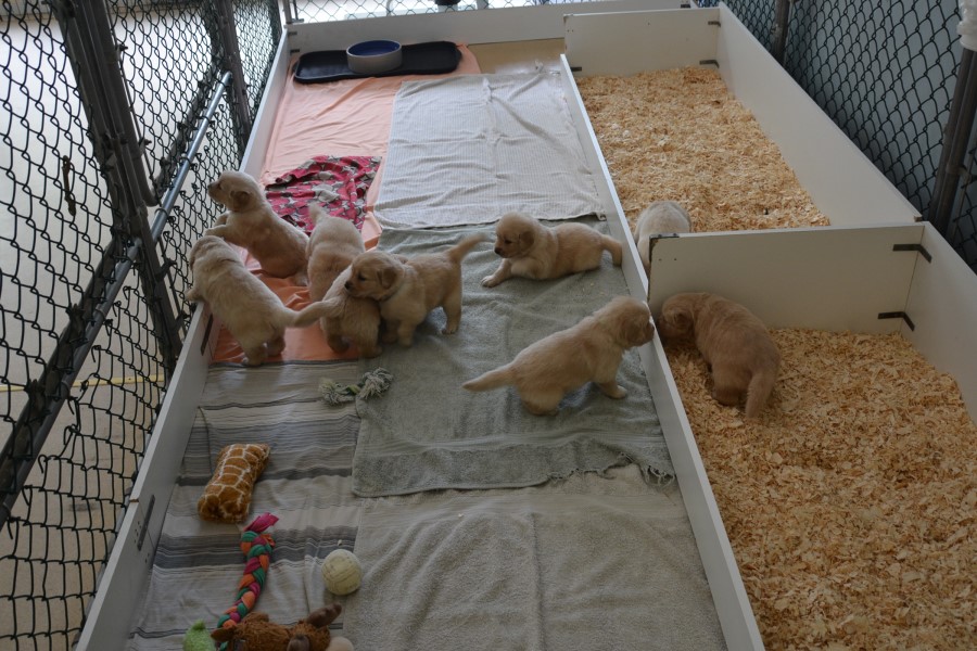 Update - August 20, 2020. Today, we removed the whelping box and set up the area the pups will live in until they leave us in 4 weeks. To this point, they have always been in the whelping box or a green bin so the move, first onto the floor while we organized and then into the new area, was a bit of a shock. However, as usual, some were quick to adapt while others took more time. In the end, they were playing with the new toys and with each other, nursing from Tilda and then falling asleep. This is the start of the pups' weaning. Tilda will not be with them full-time, but will visit for nursing. We will feed them solid food. As the weeks go by, the nursings will be decreased and the solid feedings increased until they are fully weaned by about 7 weeks of age.