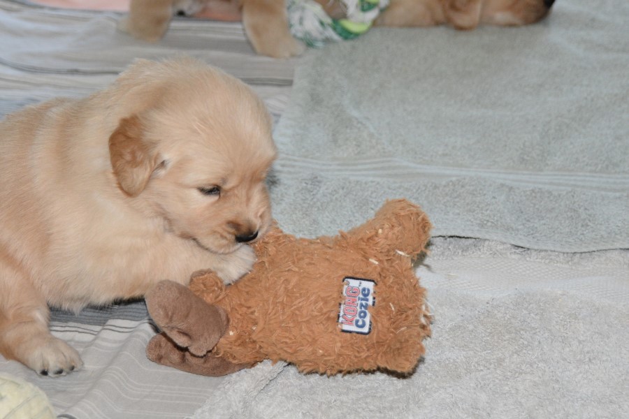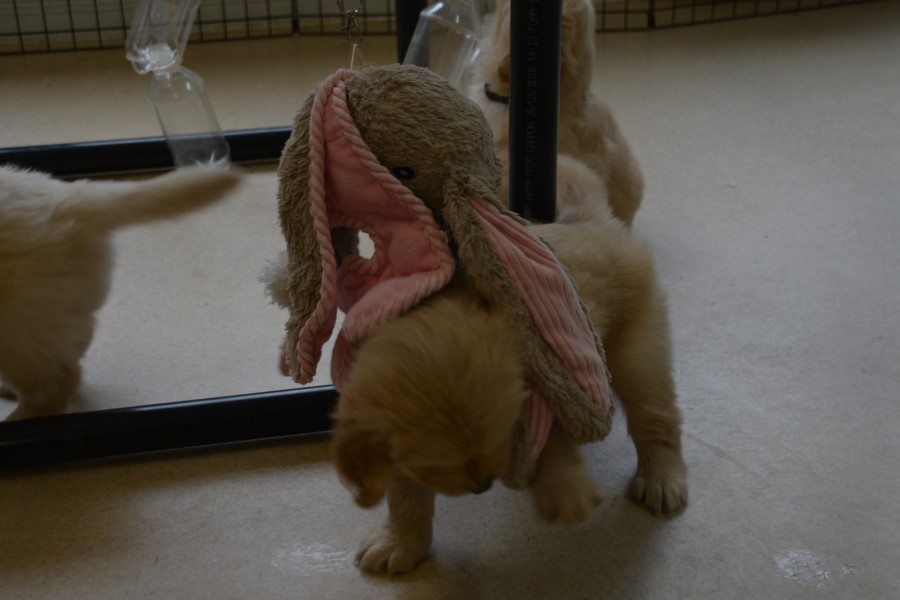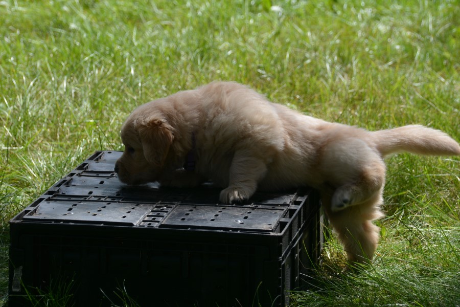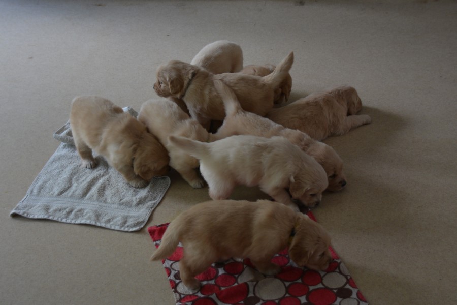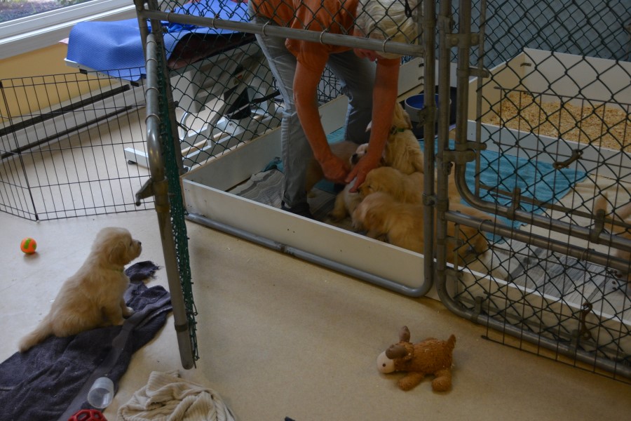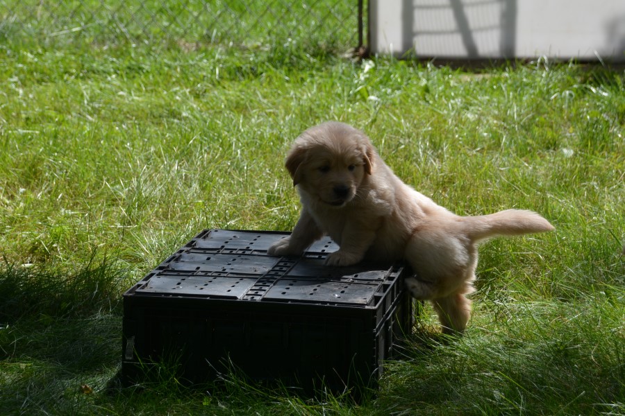 Update - August 20, 2020. Today, we removed the whelping box and set up the area the pups will live in until they leave us in 4 weeks. To this point, they have always been in the whelping box or a green bin so the move, first onto the floor while we organized and then into the new area, was a bit of a shock. However, as usual, some were quick to adapt while others took more time. In the end, they were playing with the new toys and with each other, nursing from Tilda and then falling asleep. This is the start of the pups' weaning. Tilda will not be with them full-time, but will visit for nursing. We will feed them solid food. As the weeks go by, the nursings will be decreased and the solid feedings increased until they are fully weaned by about 7 weeks of age.