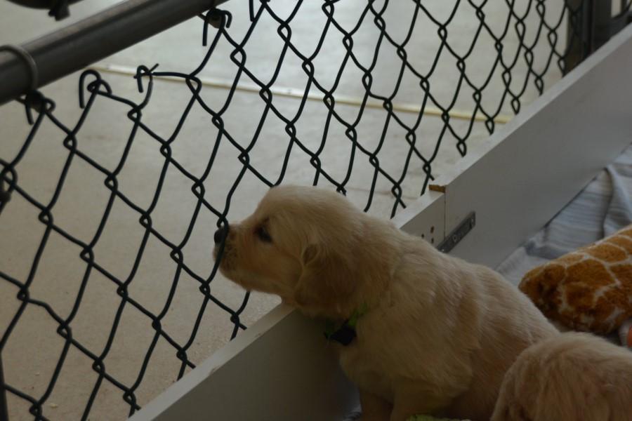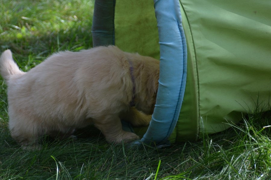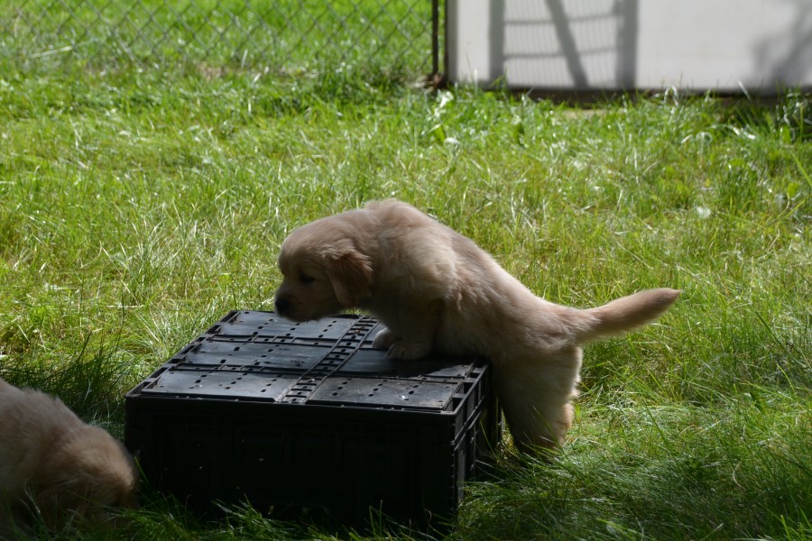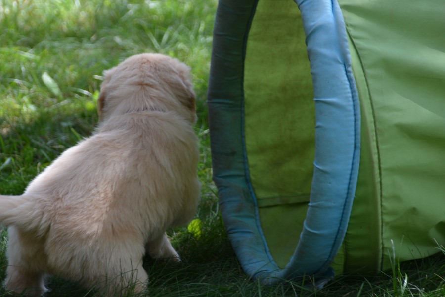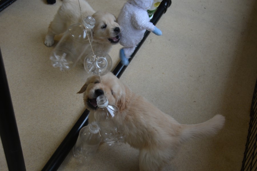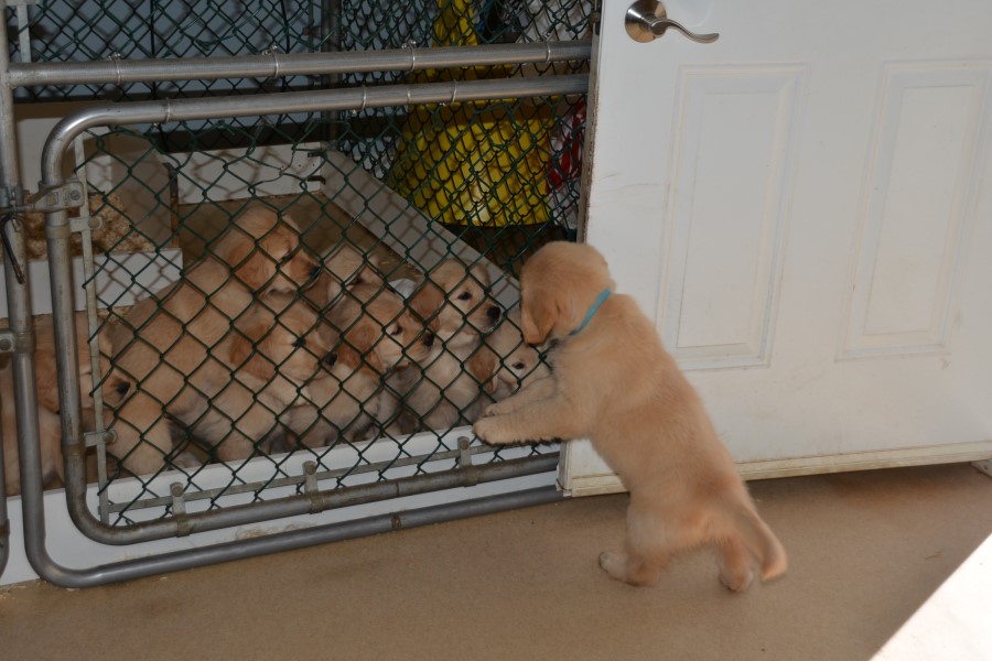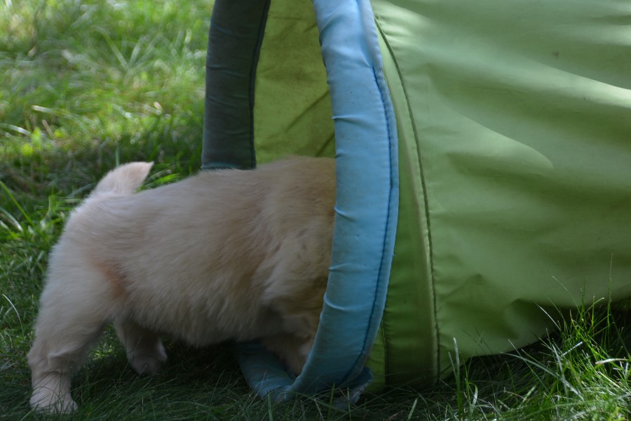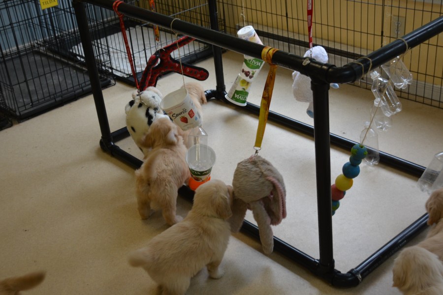 First time with the activity center - September 2, 2020. Previous litters have enjoyed playing with the activity center. Today was the first time this group had seen it and they were immediately interested. Here are pictures of the pups leaving the pen, playing with the hanging toys then returning to the pen, some with no help, others with some help and one with lots of help. Once in the pen, they discovered that there was some dry kibble on the floor. They'll be quicker coming in next time!