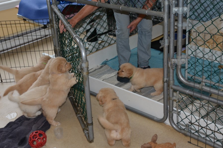 Update - September 13. On our September 2 post, we mentioned that we put some of the pups' dry food in the pen to encourage them to go back when we open the gate. Here is a short VIDEO showing how quickly they now leave the pen and return. The final part shows them looking for the last few pieces of kibble. September 18 - Ready to go home. The pups are almost 8 weeks old. They have been weaned, dewormed, socialized, vet-checked, vaccinated and microchipped. They are active, friendly, inquisitive and healthy and are completely ready to go to their forever homes tomorrow. They spent a few hours outside today. Here are a few pictures.